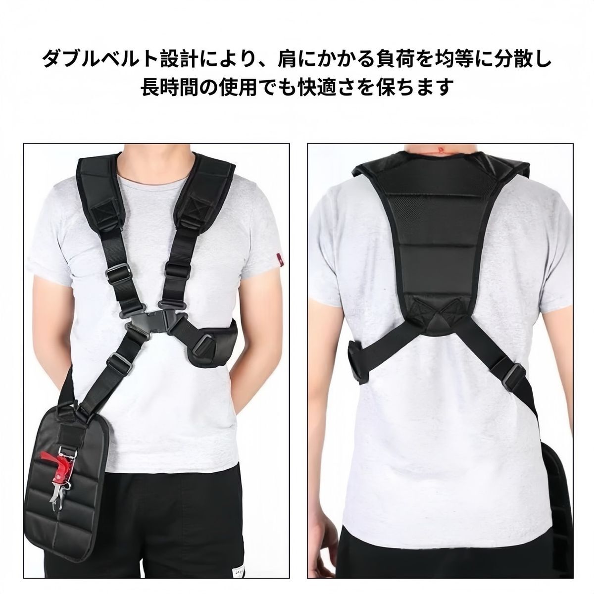 ダブルベルト設計: 肩にかかる負荷を均等に分散する設計で、長時間の作業でも肩や腰に負担がかかりにくい。
