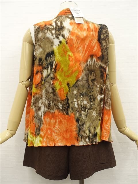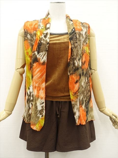 シフォンジレベスト+キャミソール+キュロットパンツ コーディネート上下3点セット M相当 ブラウン×オレンジ×イエロー 総柄/キャメル×ブラック/ブラウン シンプル・カジュアル系 30代~40代