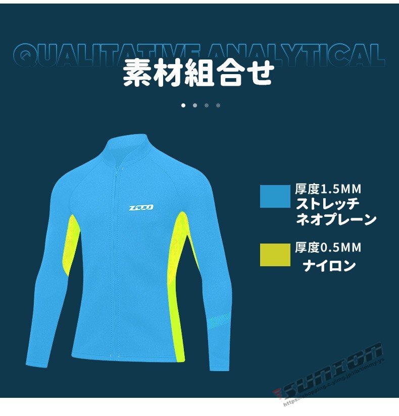 【商品スペック】【素 材】ストレッチネオプレーン、両面ナイロン【厚さ】 1.5mm【商品特徴】◇保温効果だけではなく、日焼け対策やクラゲ対策にもなります。◇海水浴やプール、川でのスイミングはもちろん、サーフィン、カヌー、ダイビング、ヨットなどのアクティブなシーンでも大活躍。【保管について】☆海から上がったら、なるべく早めに洗う。☆熱いお湯はNG、必ず水かぬるま湯で洗う。☆乾燥は直射日光を避け、細いハンガーは使用しない。しっかりと乾燥したら、なるべく早めに表面へ戻す。