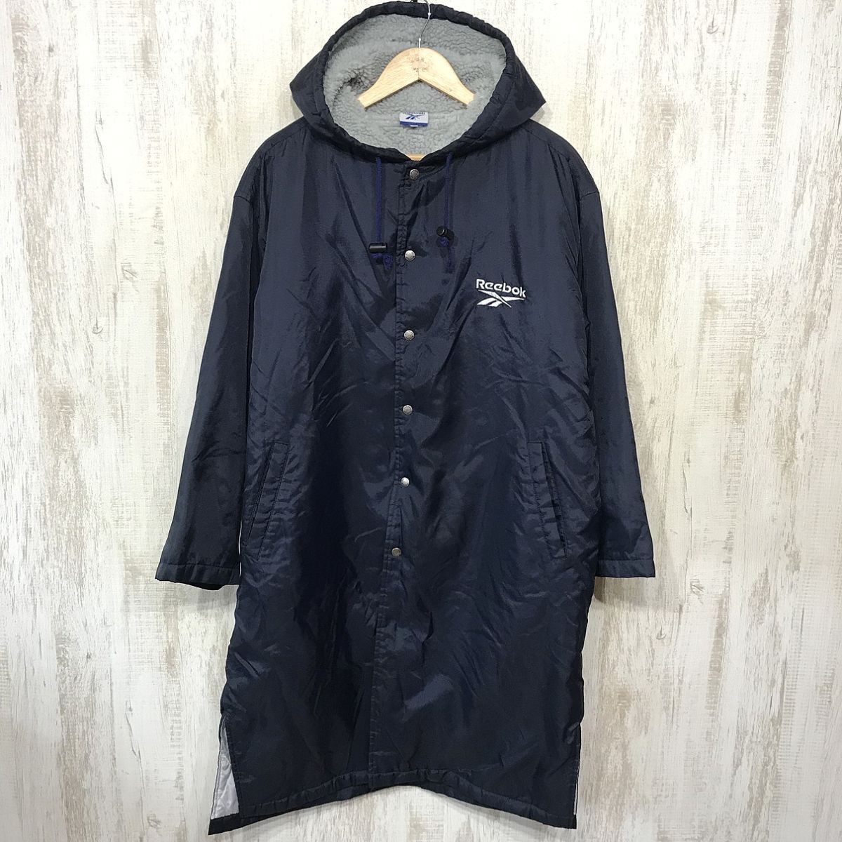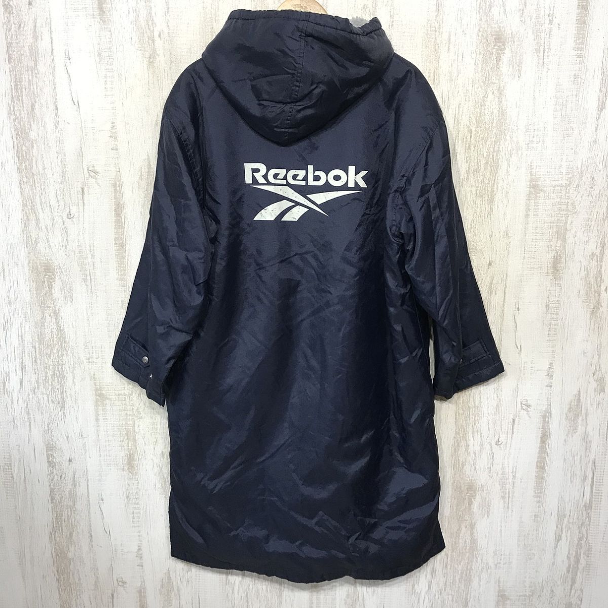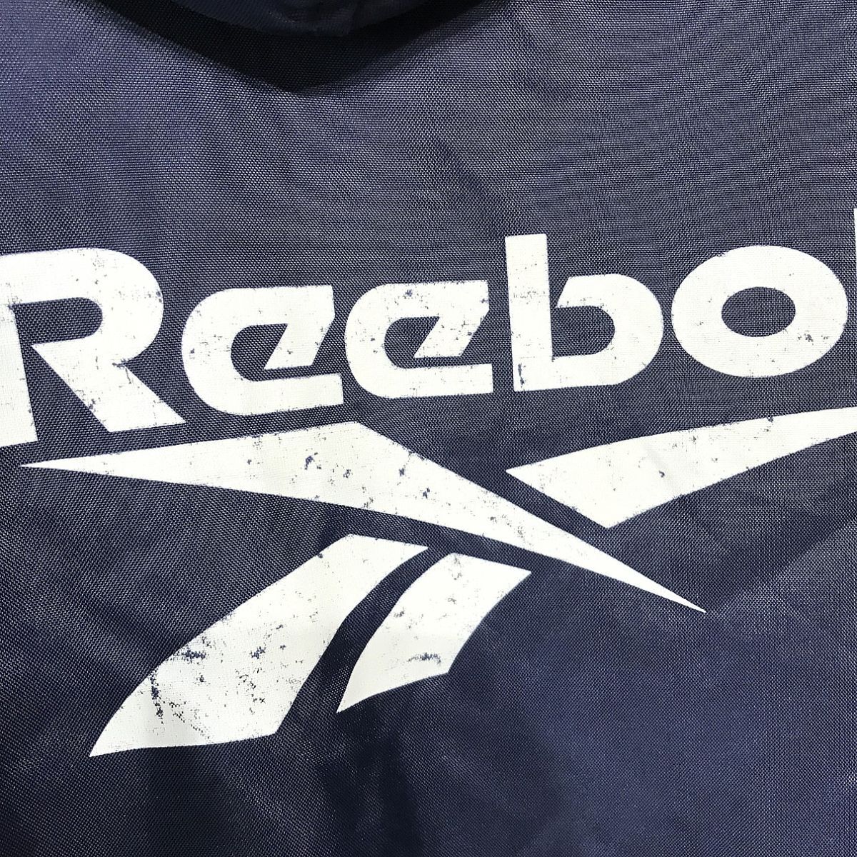 ブランド名:Reebok サイズ:M 着丈:110 cm 袖丈:74 cm 肩幅:なし 身幅:66 cm 色:紺 状態:多少汚れ、プリント劣化有。 | ||||||||||||||||||||||||||||||||||||||