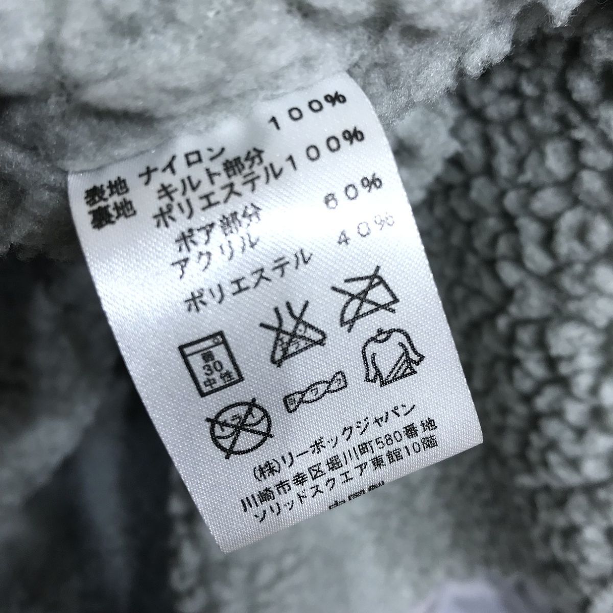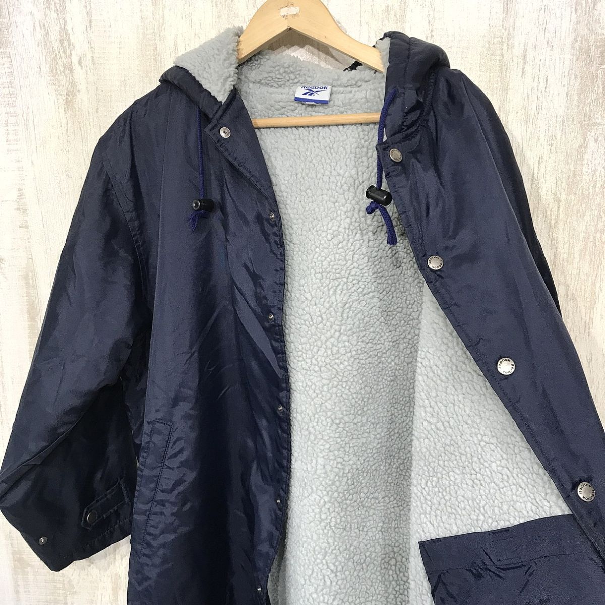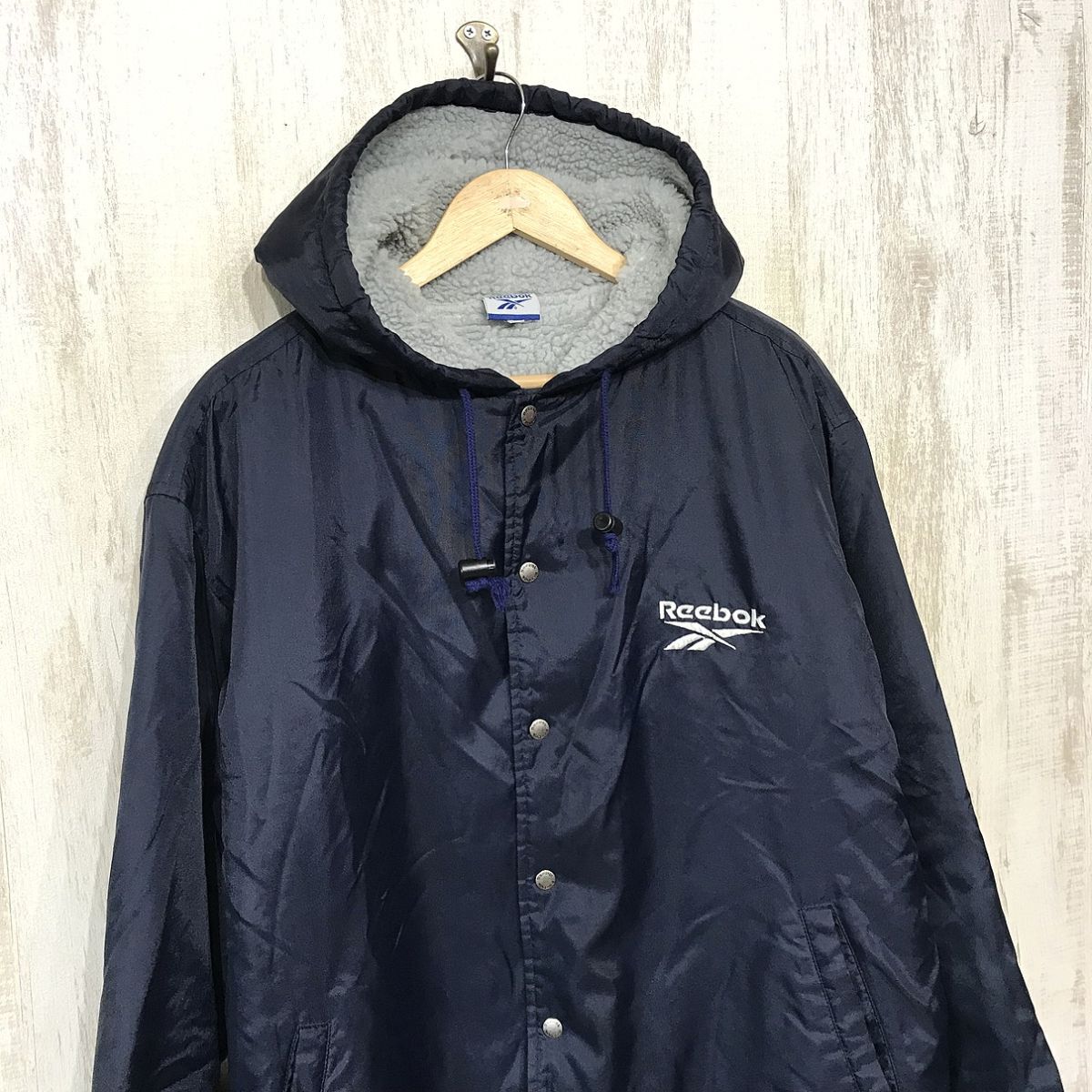 ブランド名:Reebok サイズ:M 着丈:110 cm 袖丈:74 cm 肩幅:なし 身幅:66 cm 色:紺 状態:多少汚れ、プリント劣化有。 | ||||||||||||||||||||||||||||||||||||||