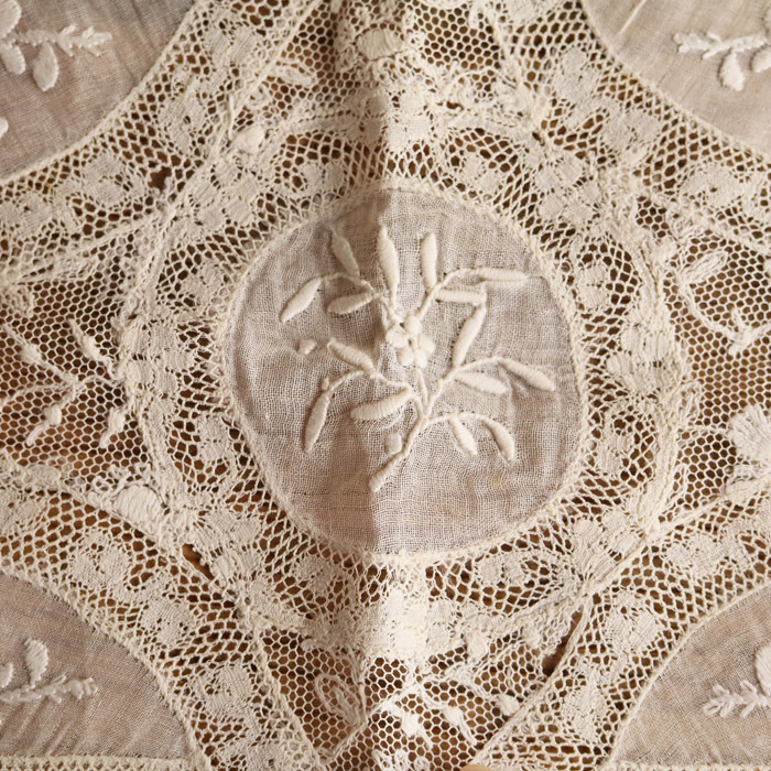 淡いベージュ系の優しい色合いが美しい、ノルマンディーレースのドイリーです。