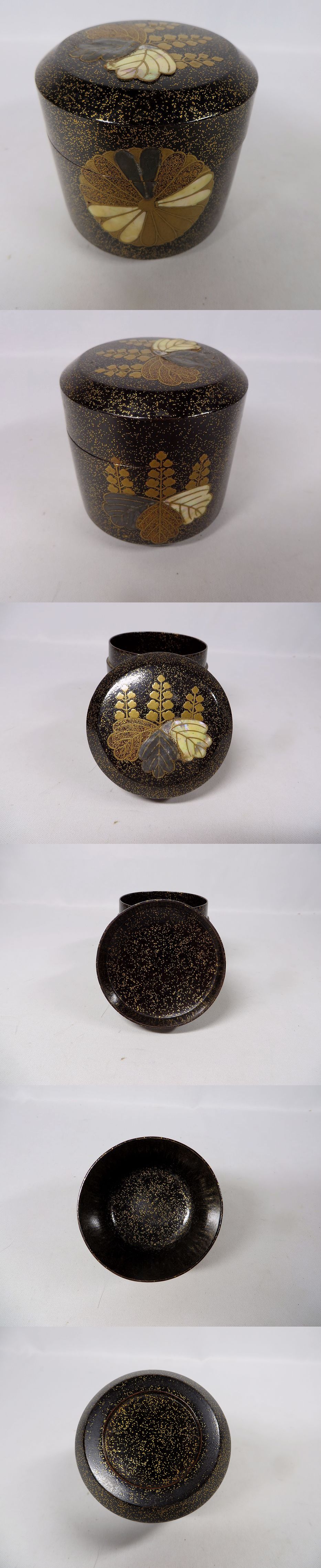 高さ8 口径7.6 時代蒔絵が美しい青貝入り菊桐棗です。惺斎が極めています。 目立った傷みは無いようです。