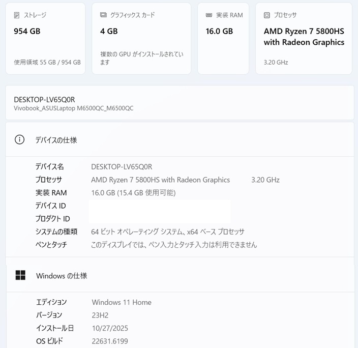 CPU:AMD Ryzen 7 5800HS 3.2GHz/8コア