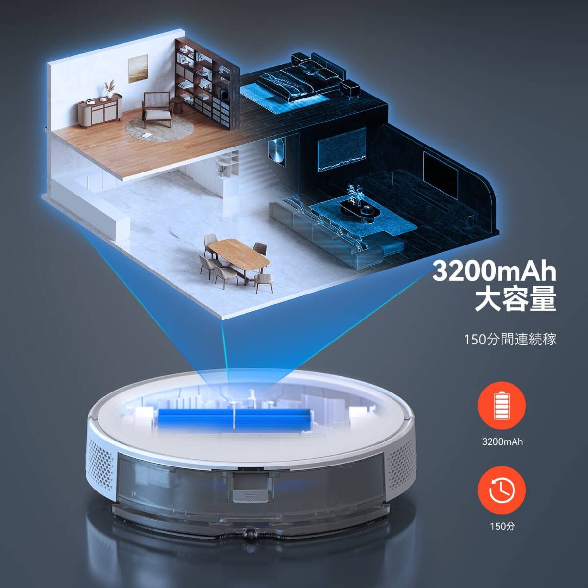 • 【150min連続稼働】標準モードで最大150分間連続稼働できるので、広範囲を一度できれいに掃除したい方におすすめです。また、2つのサイドブラシとメインブラシを搭載しており、汚れやゴミを集めて持ち上げてから吸い取れます。