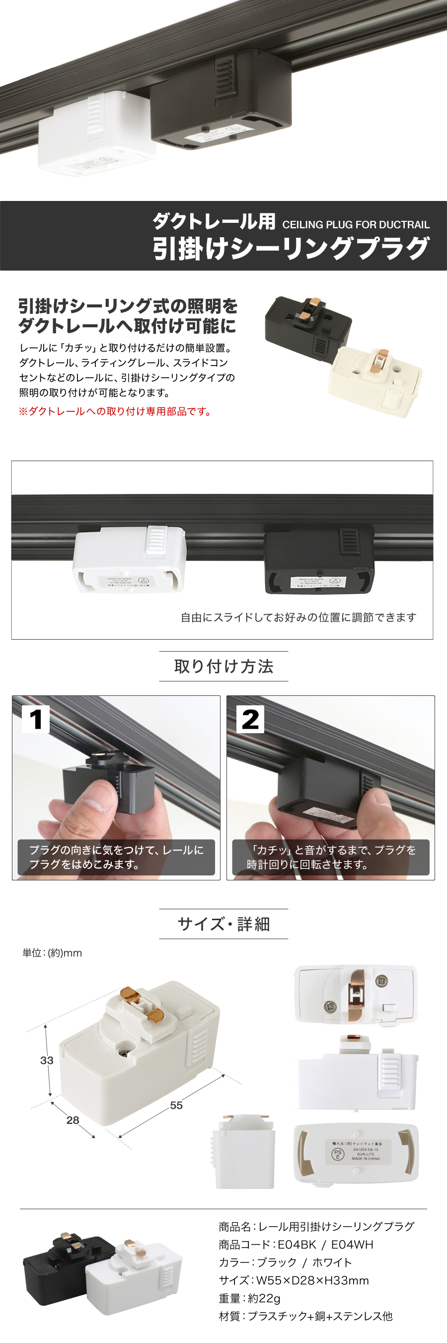 ダクトレール用の引掛シーリングの付いた照明器具用のプラグです。 簡単に取り付けができるので、工事の必要はありません♪ 【商品コード】E04WH 【仕様】 カラー:ホワイト 本体サイズ(約):(約)幅55mm×長さ28mm×高さ33mm 重量(約):22g 材質:プラスチック、銅、ステンレス他 【注意事項】 ・必ず天井設置用のダクトレールに取り付けてください。 天井設置以外のダクトレールに取り付けると、断線や接触不良など、故障に繋がる恐れがあります。 ・商品は、モニターによって色合いが異なって見える場合があります。 ・仕様・デザインは改良のため予告なく変更することがあります。 【もちろん新品未使用品です】 ▼検索ワード ダクトレール スポットライト 照明 E26 口金 簡易取付式 レール照明 ライティングレール シーリングライト ペンダントライト スポットライト 北欧 照明 インテリア照明 スポット照明 天井照明 照明器具 天井 間接照明 おしゃれ お洒落 スタイリッシュ |