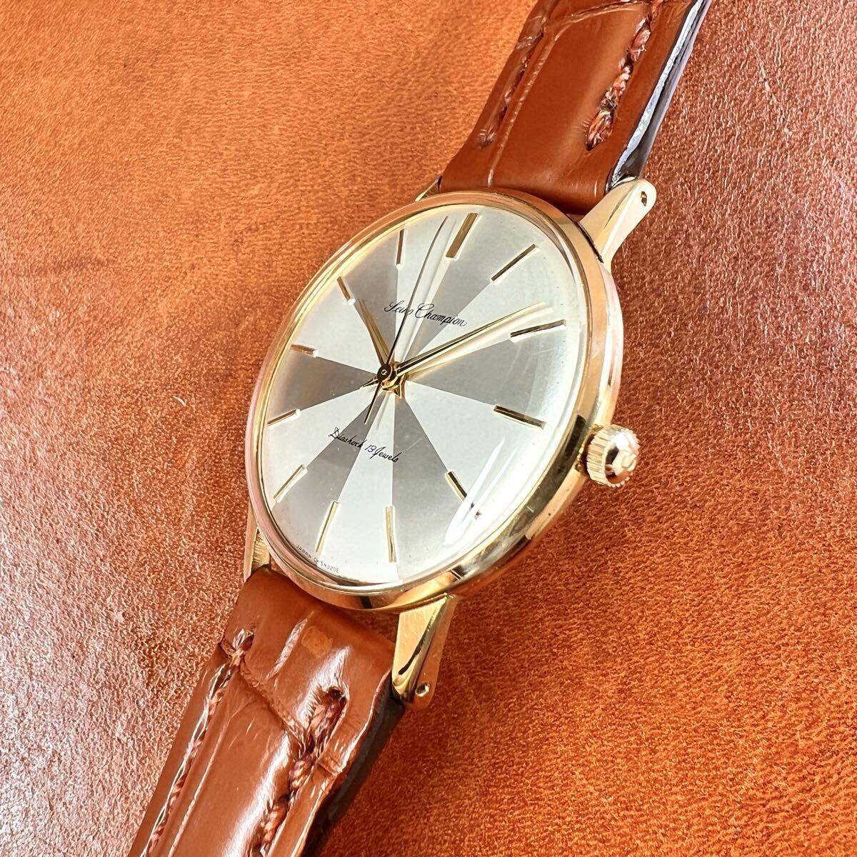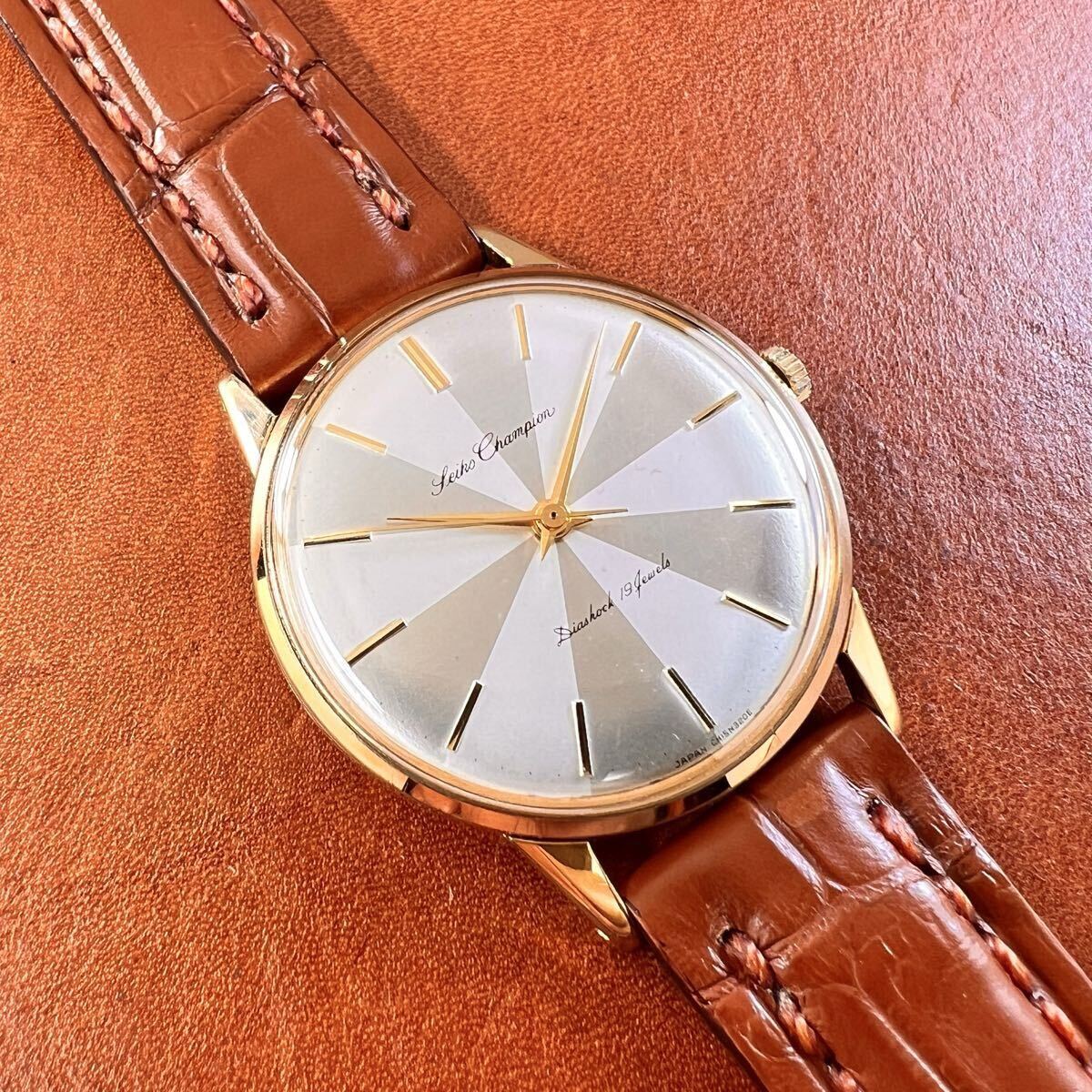OH済! 極上美品! SEIKO Champion 19石 変わり文字盤 クロコダイル本革 手縫いベルト セイコー チャンピオン 15025DE GOLD 手巻 国産 腕時計