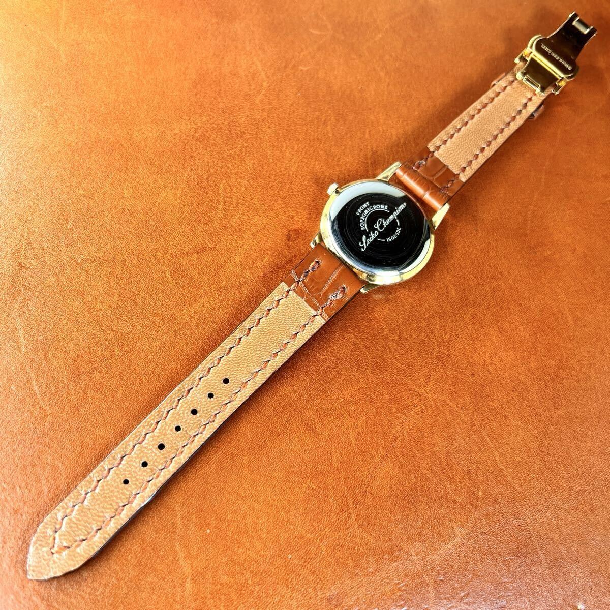 *ベルトはこの時計に合わせて最近作成したばかりの、作りたて未使用です。参考まで作成途中の写真をアップしております。