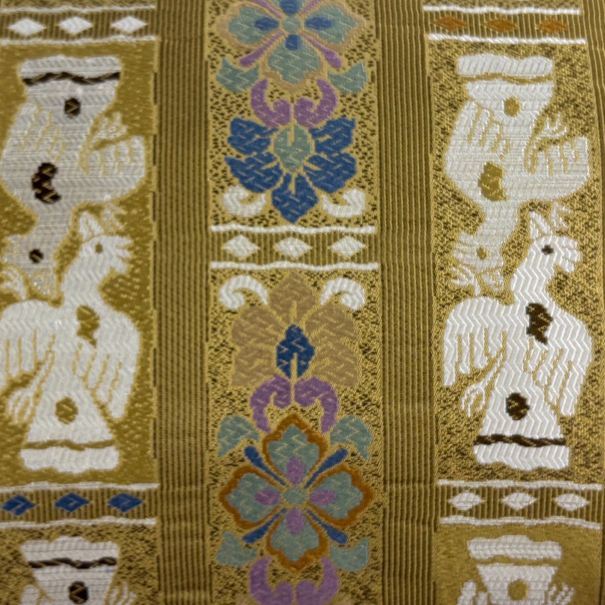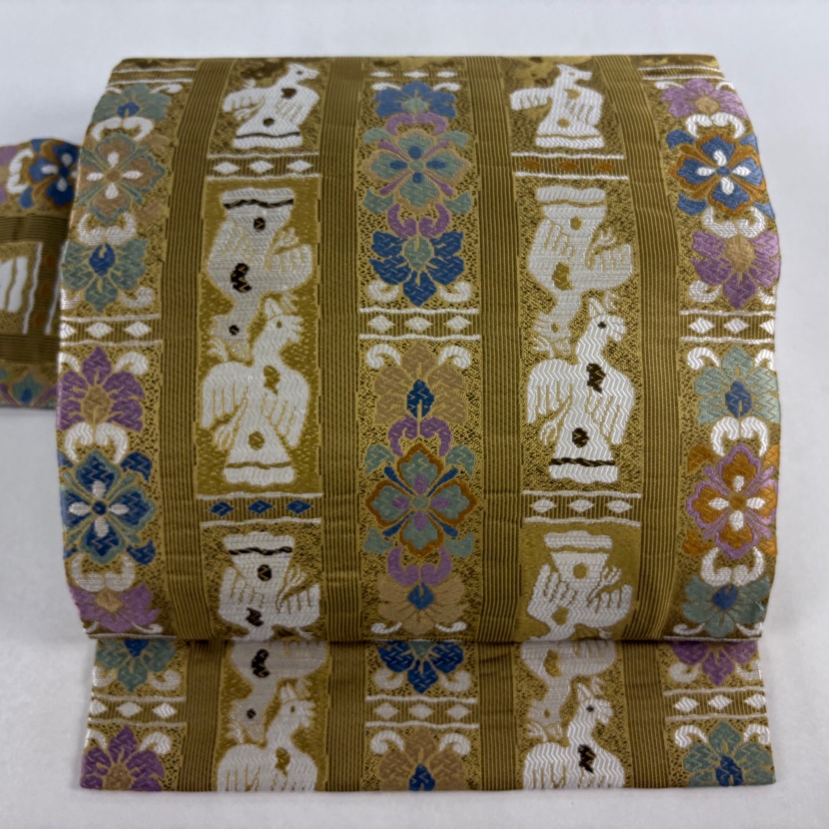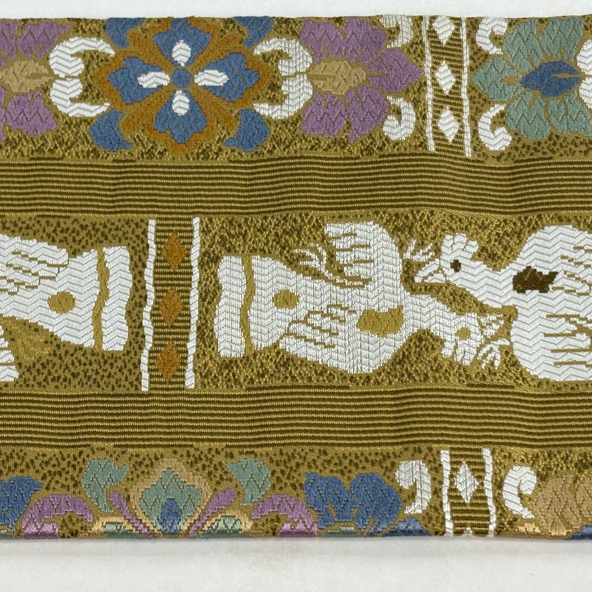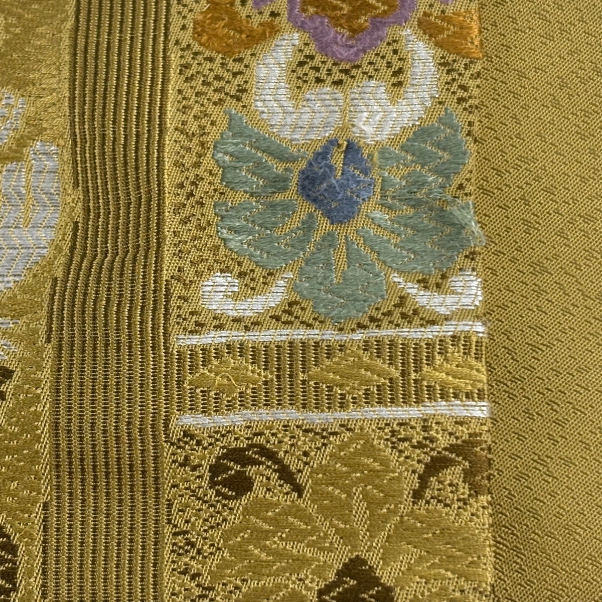 | 名古屋帯 秀品 鳥 草花 唐織 茶緑色 正絹 【中古】 |