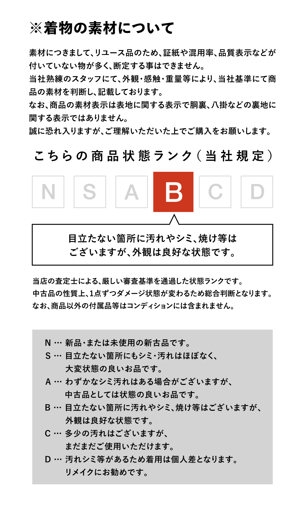 | 着物参考サイズ 採寸について | 着物商品 ランクについて | 着物状態 ランクについて |