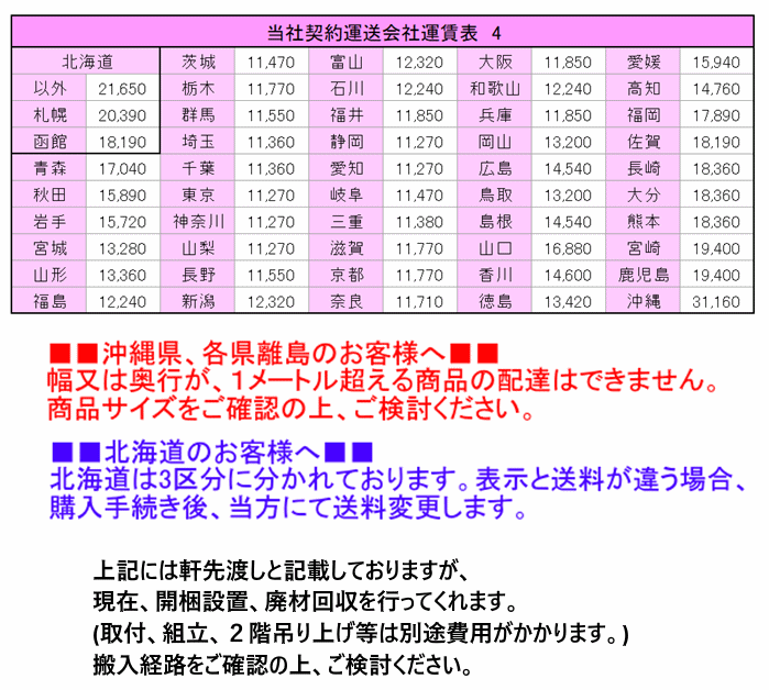◆静岡県袋井市からの出品です ◆ 静岡県袋井市からの出品です。 商品は、運賃(梱包費込)元払いでの発送です。 運賃は、以下の通りです。こちらの商品は、当社契約運送会社を利用し,、軒先渡しとなります。 お振込~納品まで1週間~2週間見てください。 沖縄県及び各県離島のお客様の場合、幅・奥行が1メートルを超える商品のお届けはできません。商品サイズをご確認ください。 ![]() ●商品のお預かりは落札後10日間とさせて頂きます。(期日を過ぎた場合、保管料を頂きます。) |