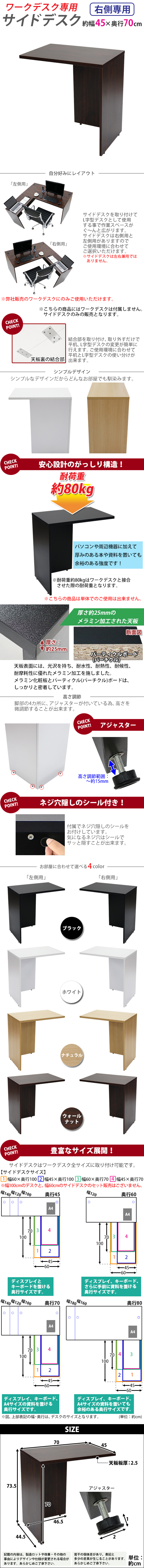 | 商品紹介 | ■弊社販売のワークデスクにのみご使用いただけます。 (こちらの商品は、弊社販売のワークデスクworkdesk,desk07,desk11にのみ使用可能です。) ■作業スペースを広く確保出来る、ワークデスク専用のサイドデスクです。 ■幅が約45cmのタイプです。 ■付属のプレートでワークデスクとサイドデスクを固定するだけの簡単接合。 ■会議室や事務所等、オフィス家具として様々なシーンでお使いいただけます。 ■天板には、メラミン加工を施しています。 ■天板裏の結合金具、ネジ穴隠しのシール付き。 ■アジャスターで高さの調節が可能です。(高さ調節範囲〜約15mm) ※こちらの商品は、組立て式です。組立てにはプラスドライバーが必要です。お客様でご用意ください。 ※組立図が付属します。 ※サイドデスクの取り付けはデスクの右側専用となります。 ■材質:パーティクル(パーチクル)ボード(メラミン加工)(本体)、プラスチック(アジャスター) ■重量:約13kg ■耐荷重:約80kg(ワークデスク接合時) ●新品商品ではありますが、輸入商品の為、多少の擦り傷などがある場合がございますので、ご納得の上ご購入下さいませ。 ●ご購入後、お客様ご都合によるご返品、ご返金等は一切お受け致しておりません。 ●本商品を使用した際に発生したトラブル、事故につきまして、当社は一切の責任を負いません。ご使用に関しましては、全て自己責任にてお願い致します。 ※カラーはウォールナットとなります。 |