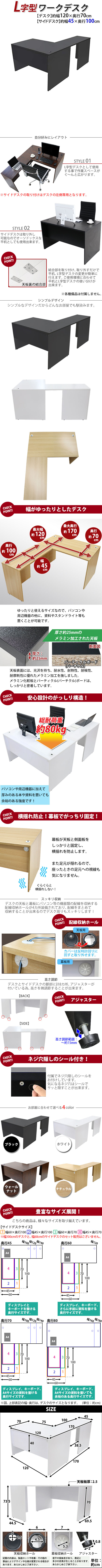 | 商品紹介 | ■作業スペースを広く確保出来る、L字型ワークデスクです。 ■サイドデスクの幅が約45cmのタイプです。 ■会議室や事務所等、オフィス家具として様々なシーンでお使いいただけます。 ■天板には、メラミン加工を施しています。 ■幕板が天板と側面板をがっちりと固定!横揺れを防止します。 ■ネジ穴隠しのシール付き。 ■デスクの天板と幕板に配線収納ホールが2カ所ずつ備わっています。 ■アジャスターで高さの調節が可能です。(高さ調節範囲〜約15mm) ※こちらの商品は、組立て式です。組立てにはプラスドライバーが必要です。お客様でご用意ください。 ※組立図が付属します。 ※サイドデスクの取り付けはデスクの左側専用となります。 ■材質:パーティクル(パーチクル)ボード(メラミン加工)(本体、サイドデスク)、プラスチック(アジャスター、配線収納ホール) ■重量:約47kg(デスク:約31kg、サイドデスク:約16kg) ■総耐荷重:約80kg ●新品商品ではありますが、輸入商品の為、多少の擦り傷などがある場合がございますので、ご納得の上ご購入下さいませ。 ●ご購入後、お客様ご都合によるご返品、ご返金等は一切お受け致しておりません。 ●本商品を使用した際に発生したトラブル、事故につきまして、当社は一切の責任を負いません。ご使用に関しましては、全て自己責任にてお願い致します。 ※カラーはブラックとなります。 |