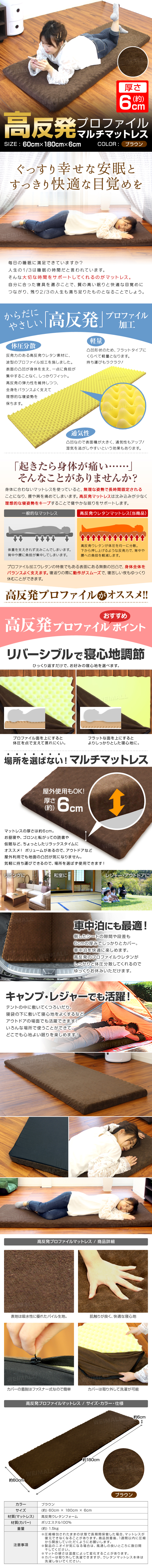 ちょっとした時のリラックスタイムに! 高反発プロファイル マルチマットレスです。 マルチマットレスは、高反発ウレタンで弾性が高く、適当な硬さで体を支えます。 高反発ウレタンには、プロファイルを採用しているので各凹凸が体を点で支えることで負担が一点に集中しないのが特徴です。 通気性にも優れ、熱がこもりにくく、湿気を逃す効果もあります。 お昼寝時や転がって読書や仮眠したい時など、リラックスタイムにおすすめ。 車中泊やキャンプにも最適です! クルクルと丸めることができ、収納持ち運びにも便利です。 【商品仕様】 内容:本体 ×1 カラー:ブラウン サイズ:(約)60cm×180cm×6cm 重量:(約)1.5kg 素材:高反発ウレタン、ポリエステル100% 【注意事項】 ・圧縮梱包されたままの状態で長期間保管した場合、マットレスが復元できなくなってしまいます。商品到着後、すぐ圧縮から開放をして頂くようにお願いいたします。 ・マットレスは約1~2日で復元します。気温や温度により3~14日かかる場合もあります。 ・製品の臭いが気になりましたら、風通しの良いところで脱臭してください。この臭いは素材のウレタンによるもので無害です。臭いに敏感な方は十分ご検討の上、ご購入をお願いいたします。 ・マットの硬さは温度によって変わってきます。また、硬さの感じ方には個人差があります。 ・カバーは取り外して洗濯ができますが、マットレス本体は洗濯しないでください。 ・商品は、モニターによって色合いが異なって見える場合があります。 ・仕様・デザインは改良のため予告なく変更することがあります。 |