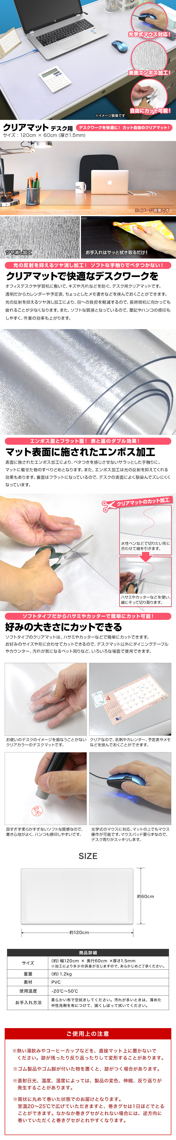 | カレンダーや予定表、メモなど挟めるクリアタイプのデスクマットです。 光学式マウスにも対応しているので、マウスパッドを使用せずにマウス操作ができます。 デスクマット表面にエンボス処理を施すことで、ベタつきを感じさせないサラっとした表面になっています。 また、このエンボス処理は光の反射を抑えてくれる効果も◎! ハサミで簡単にカットができるので、デスクマット以外にも、様々なシーンで使用できます! 【商品仕様】 カラー:クリア サイズ(約):幅120cm×奥行60cm(厚さ1.5mm) 材質:軟質PVC 使用温度(約):−20℃〜50℃ ※お手入れは薄めた中性洗剤を湿らした布につけ、固く絞って拭いた後、水分が残らないように乾いた布で乾拭きしてください。 ※日の当たる所で使用しないでください。日焼けで硬化する場合があります。 (デスクマット 透明 クリアデスクマット PVC製 ソフトタイプ 保護シート 机 学習机 学習机マット パソコンデスク クリアマット 透明マット テーブル クリア マット デスクシート クリアーデスクマット テーブルマット 光学マウス対応) |