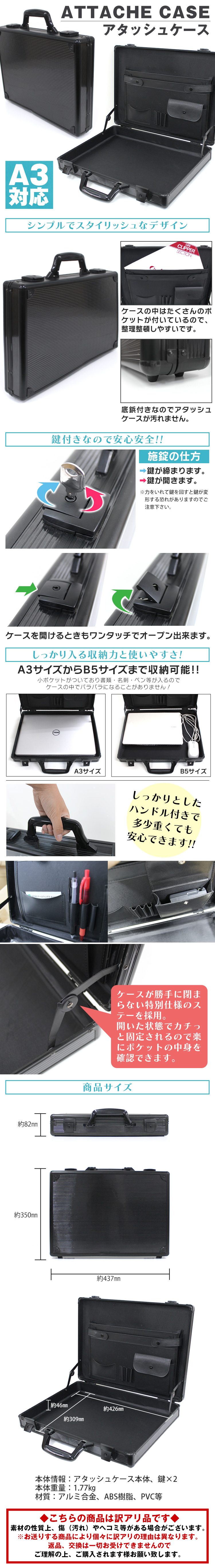 | どなたにも似合う人気のブラック! 軽量で頑丈、抜群の容量を誇るアルミアタッシュケース。 シンプルなデザインと軽量で丈夫なボディでシーンを選ばず大活躍! ポケットも充実たっぷり収納♪ 盗難防止用の鍵も付いていて、出張など長時間の移動にもしっかり対応します。 ノートPC・書類・メディア・貴重品の収納等、多彩な用途にご利用頂けます♪ 【商品詳細】 カラー:ブラック サイズ(約): ・外寸:437X350X82mm ・内寸:426×309×46mm 重量(約)1.8Kg 材質:アルミニウム合金、PVC、ABS樹脂他 |