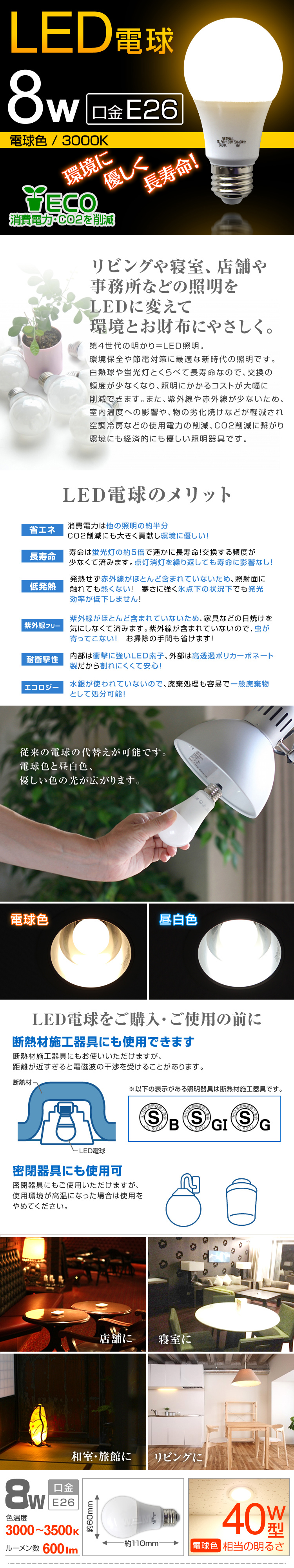 安心の1年保証付き! ECO!省エネ&長寿命のLED電球! ・落ち着いた雰囲気「電球色」 白熱電球・電球形蛍光ランプに近い光の広がり しっかり照らすタイプです。 ご使用中の照明をLEDに変えるだけで、節電効果UPします! さらに約40000時間もの長寿命!!長時間使う部屋や、取り替えにくい所にオススメです。 発熱量が少ないので、光の下にいても暑くありません。 また、LEDの光は、赤外線や紫外線をほとんど含まず、紫外線による色あせなども抑えます。 白熱灯と比べると電気代もかなりお得です♪ ■商品仕様■ 口金:E26 サイズ(約):全長110mm×最大径60mm 消費電力:8W 電圧:AC90~130V 50/60HZ 寿命:約40,000時間 ※表示寿命は設計寿命であり、製品の寿命を保証するものではありません。 色温度:電球色 3000K/昼光色6000K 全光束:電球色 600lm/昼光色640lm 材質:アルミニウム、PC樹脂 PSE取得品 ■商品内容■ LED電球 電球色 E26 8W ×6個 ■注意事項■ ・取付・取外しは必ず電源を切った状態で行なってください。 ・ランプはソケットに確実に取り付けてください。 ・リモコンタイプの照明器具は調光器に対応しておりません。 ・断熱材施工器具と密閉器具にはなるべく使用しないでください、使用寿命の減少の原因になります。 ・周囲温度が40℃を超える場所や腐蝕性環境では使用しないでください。 ・直流電源では使用しないでください。 ・点灯中・点灯直後は直接手でふれないでください。 ・水洗いや分解・改造はしないでください。水滴などがかかる場所では使用しないでください。 ・紙や布などでおおったり、燃えやすいものに近つけないでください。(火災、器具過熱の原因) ・電源を入れた状態や電源を切った後しばらくの間は、ランプが熱いので触れないでください。(ヤケドの原因) ※必ずお読み下さい ■輸入品により運送中に付く多少の傷が有る場合がございます。ご了承下さい。 ■LED寿命は熱の影響など環境により変化します。寿命は参考時間とお考え下さい。 ■コストを下げてお安く提供させて頂く為に梱包は簡易包装のみとなっております。ご了承下さい。 ■商品本体以外の備品や商品の一部仕様は予告無く変更する場合がございます。予めご了承下さい。 ◇当商品は海外製品になりますので、細かいキズ、ネジのゆるみなどがある場合がありますが、返品・交換対象とはなりません。神経質な方のご入札はご遠慮ください。 ◇商品内容はあくまでも出品概要に基づきますのでご注意ください。 ◇本商品を使用した際に発生したトラブル、事故につきまして、当社は一切の責任を負いかねます。 ◇メーカーではないため、専門的なご質問にはお答えできません。 ◇検品確認済みですので破損以外の交換には応じられません。商品到着時にはその場で開封、破損の有無を確認し、破損の場合には受け取らないか配送業者に申し出てください。 ◇加工および一度装着した商品の返品・交換には対応できません。事前の確認をお願いします。 また、商品の取付にかかわる費用等の弁済には対応できません。 ◇付属のコードなどの切断による、繋ぎ変えなどをされた商品に対しての、返品・交換は致しません。 ◇取り付けによる破損接続不良等責任を負いかねますので専門業者に依頼するかご自身の責任でお取り付けください。 ※一部2灯式で1つの安定機を共用する器具は工事を要する場合がございます。 ◇ご連絡もなく、行き成りの「悪い・非常に悪い」評価を頂いた場合に対しては対応できない場合もありますのでご了承ください。 |