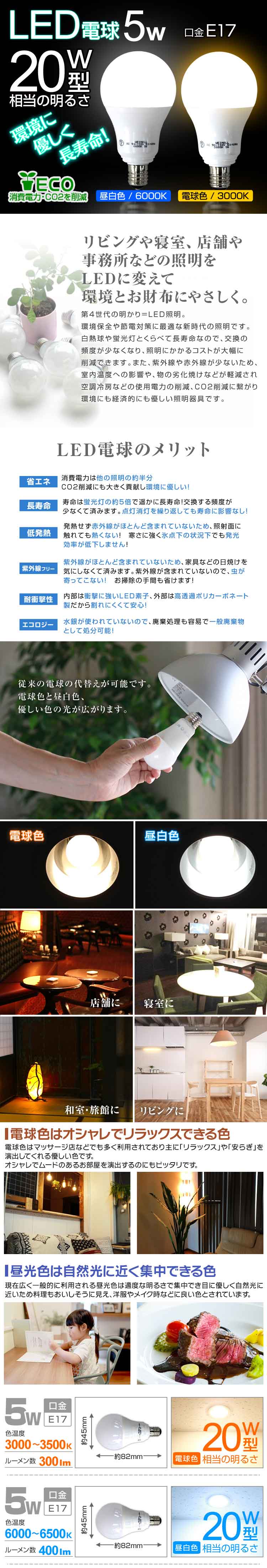| 安心の1年保証付き! ECO!省エネ&長寿命のLED電球! 落ち着いた雰囲気の「電球色」タイプです。 白熱電球・電球形蛍光ランプに近い光の広がりで しっかり照らします。 ご使用中の照明をLEDに変えるだけで、節電効果がUP! さらに約40000時間もの長寿命!!長時間使う部屋や、取り替えにくい所にオススメです。 発熱量が少ないので、光の下にいても暑くありません。 また、LEDの光は、赤外線や紫外線をほとんど含まず、紫外線による色あせなども抑えます。 白熱灯と比べると電気代もかなりお得です♪ ■商品仕様 ■口金:E17 サイズ(約):全長82mm×最大径45mm 消費電力:5W電圧:AC90~130V 50/60HZ 寿命:約40,000時間 ※表示寿命は設計寿命であり、製品の寿命を保証するものではありません。 色温度:電球色 3000~3500K 全光束:電球色 300lm 材質:アルミニウム、PC樹脂 PSE取得品 ■商品内容■ LED電球 E17 5W 電球色×1 ■注意事項■ ・取付・取外しは必ず電源を切った状態で行なってください。 ・ランプはソケットに確実に取り付けてください。 ・リモコンタイプの照明器具は調光器に対応しておりません。・断熱材施工器具と密閉器具にはなるべく使用しないでください、使用寿命の減少の原因になります。・周囲温度が40℃を超える場所や腐蝕性環境では使用しないでください。 ・直流電源では使用しないでください。・点灯中・点灯直後は直接手でふれないでください。 ・水洗いや分解・改造はしないでください。水滴などがかかる場所では使用しないでください。 ・紙や布などでおおったり、燃えやすいものに近つけないでください。(火災、器具過熱の原因) ・電源を入れた状態や電源を切った後しばらくの間は、ランプが熱いので触れないでください。(ヤケドの原因) |