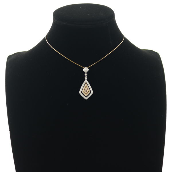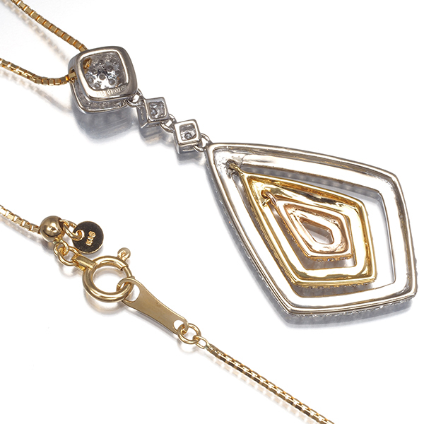 メレダイヤを敷き詰めたスリーカラーのトップデザインが煌めき輝くネックレス。総計1カラットものダイヤモンドが眩い輝きで胸元をゴージャスに演出してくれますよ。 |