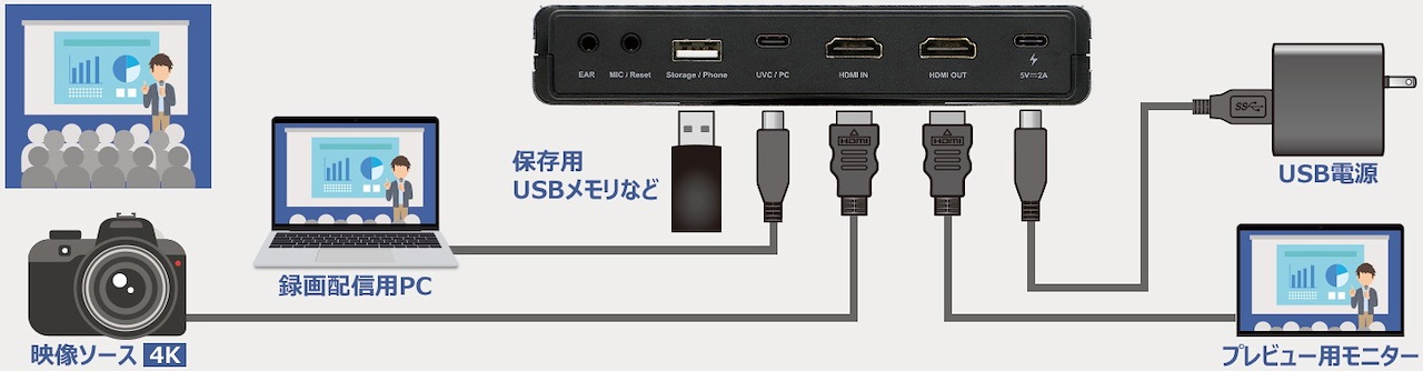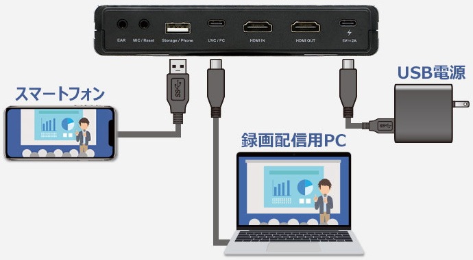 | 出力インターフェース | HDMI USB Type-C(USB3.2 Gen1) USB Type-A(USB2.0)(録画用) 3.5mmイヤホンジャック(音声) | |
