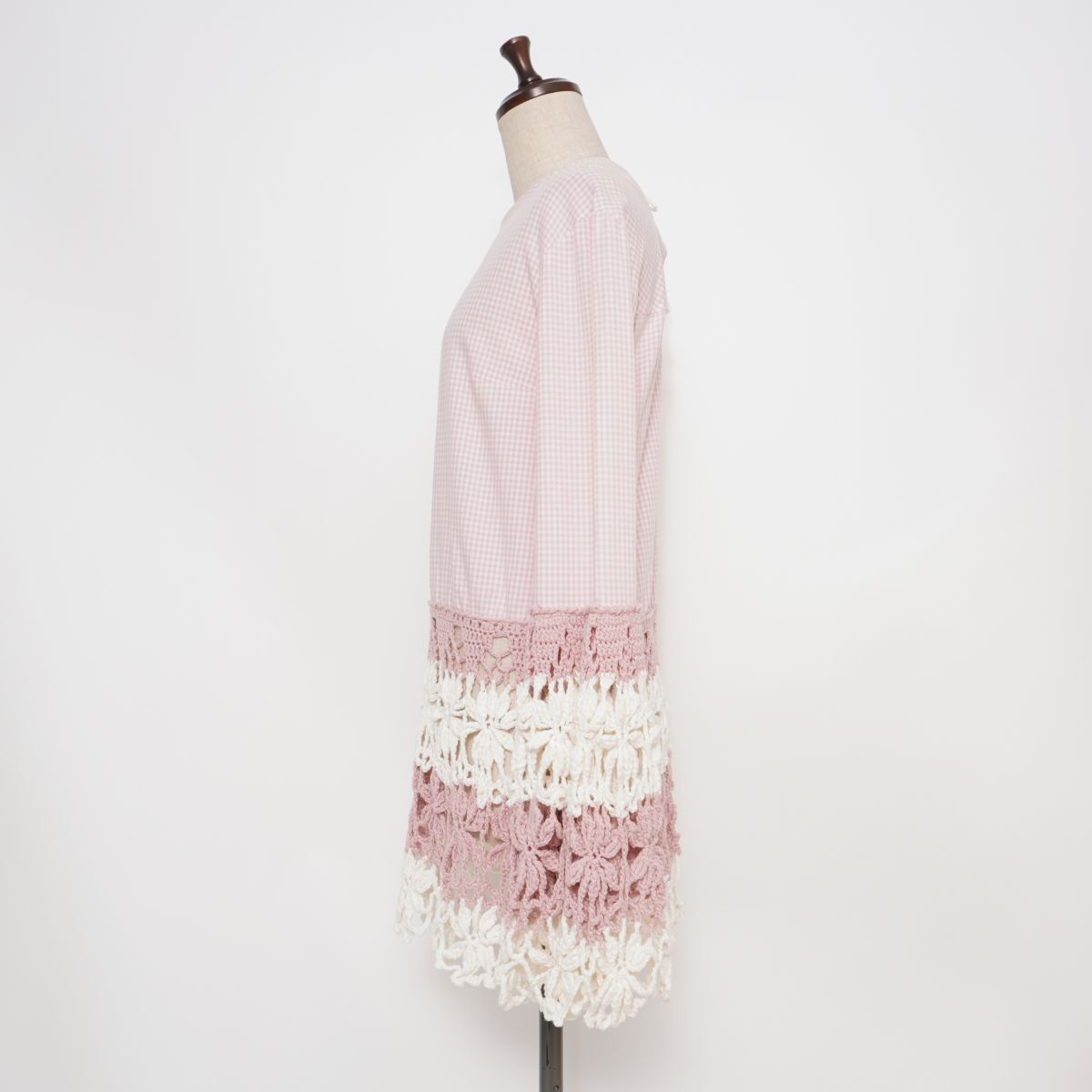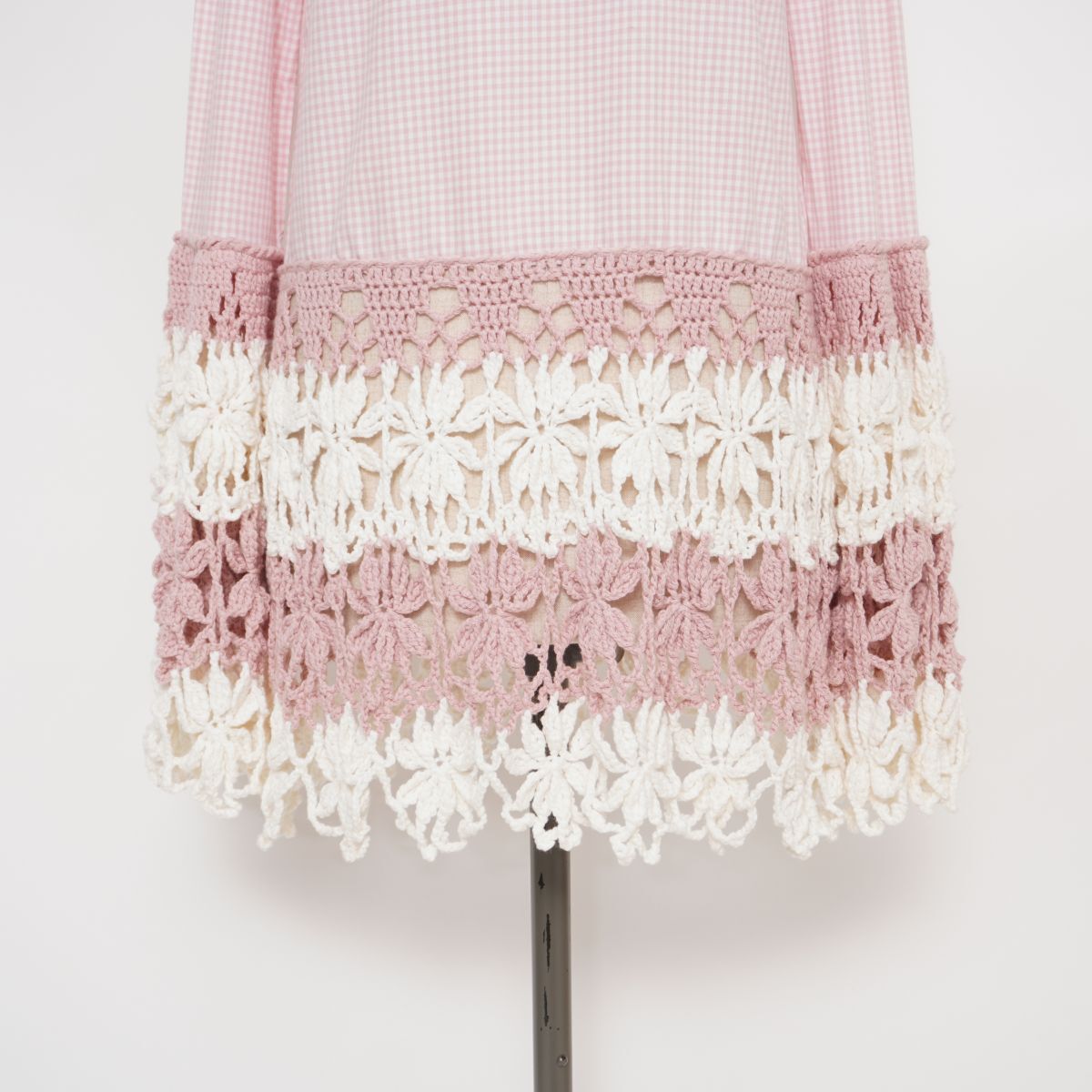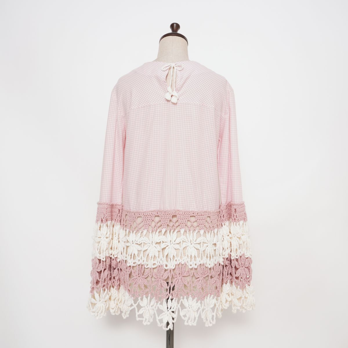 MICHAELA BUERGER ミカエラビュルガー ギンガムチェック ニットドッキングブラウス ノーカラー 鉤針 フレアスリーブ ピンク サイズXS*GD231
