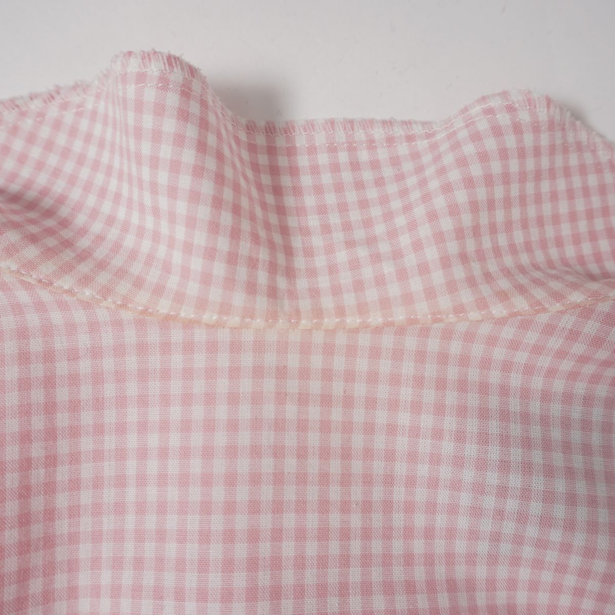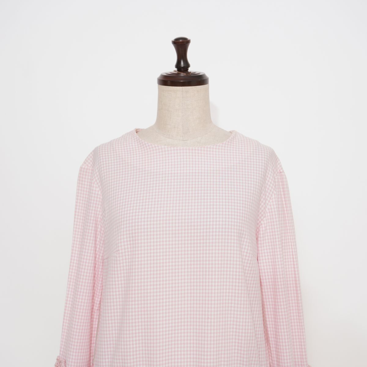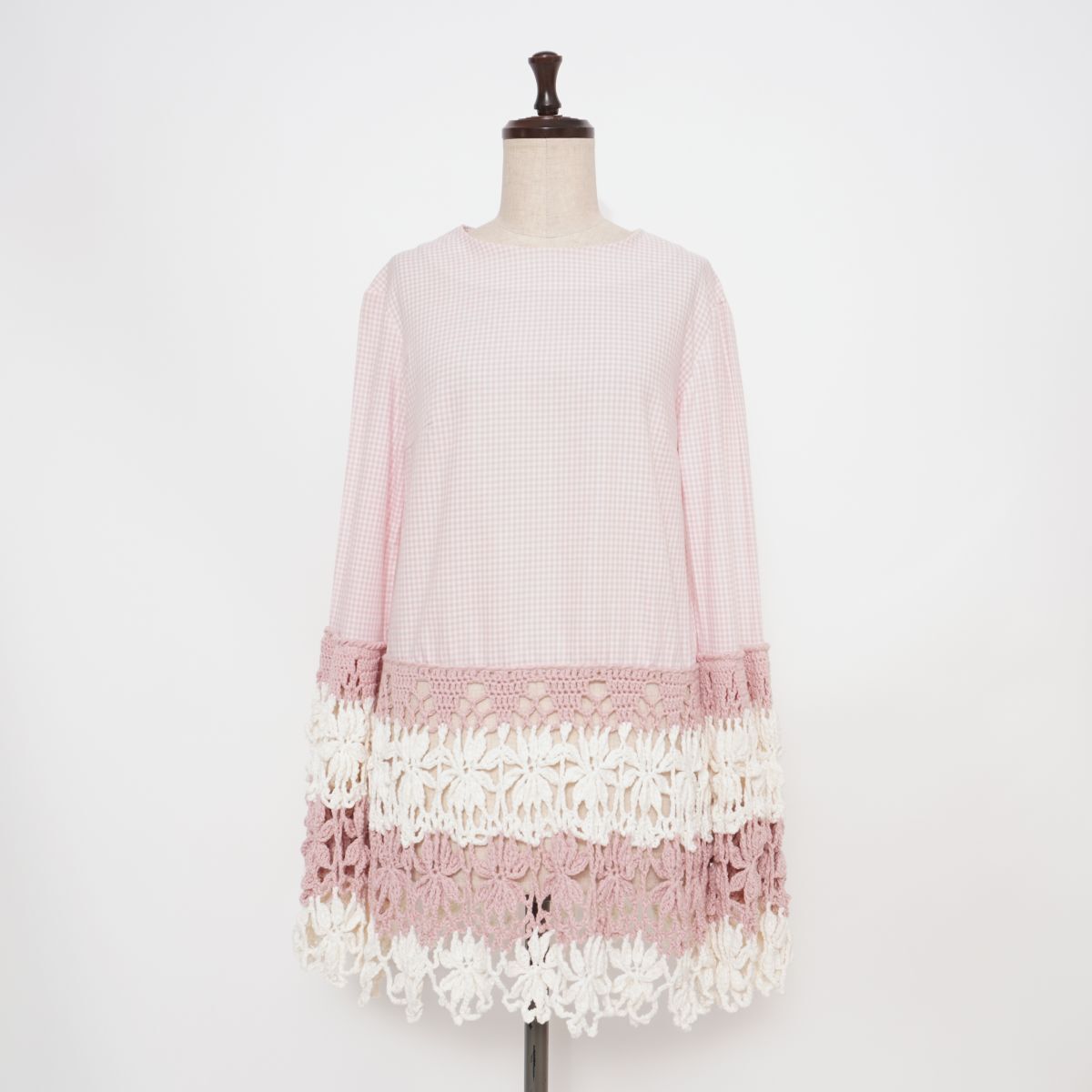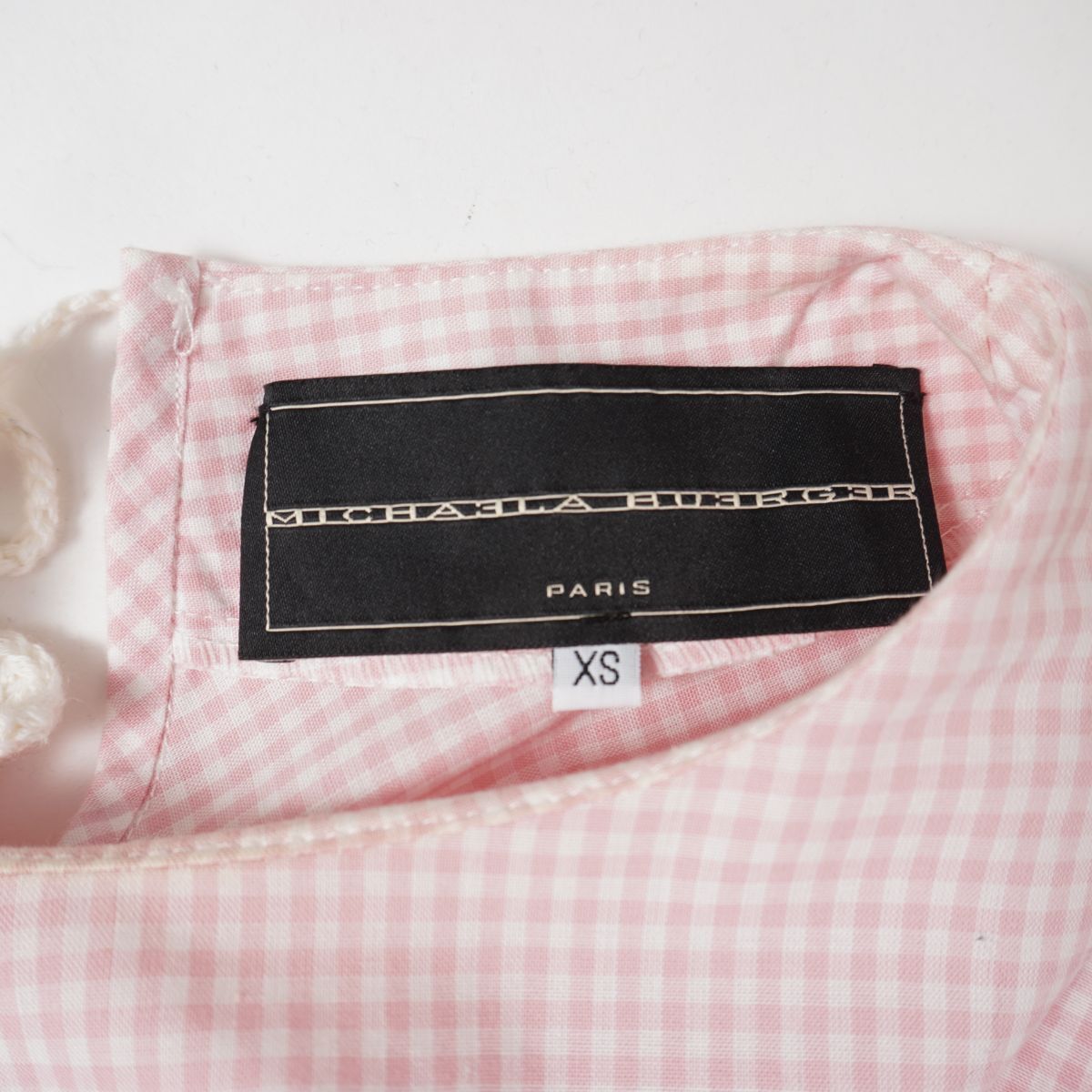 MICHAELA BUERGER ミカエラビュルガー ギンガムチェック ニットドッキングブラウス ノーカラー 鉤針 フレアスリーブ ピンク サイズXS*GD231