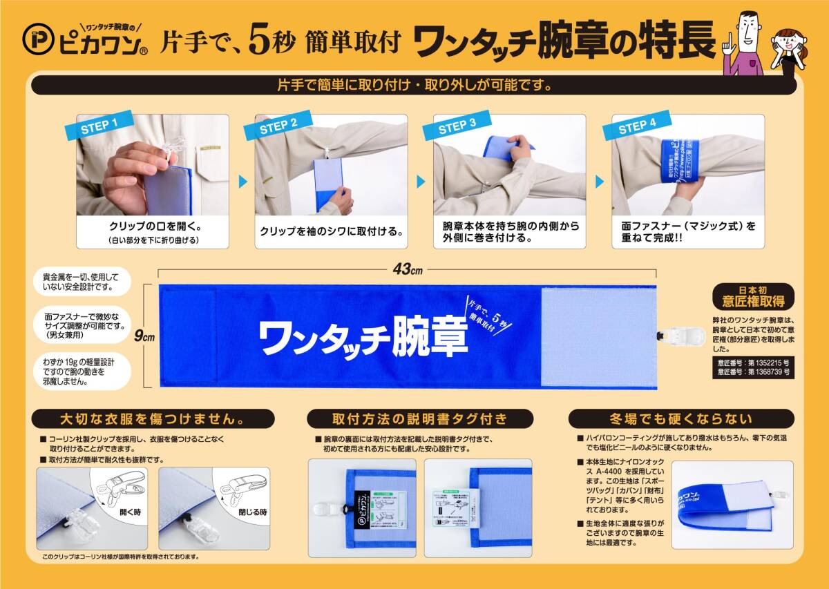 片手で5秒! 取付簡単なワンタッチ腕章。丈夫で軽量なナイロンオックス(布製)で耐久性が優れております。