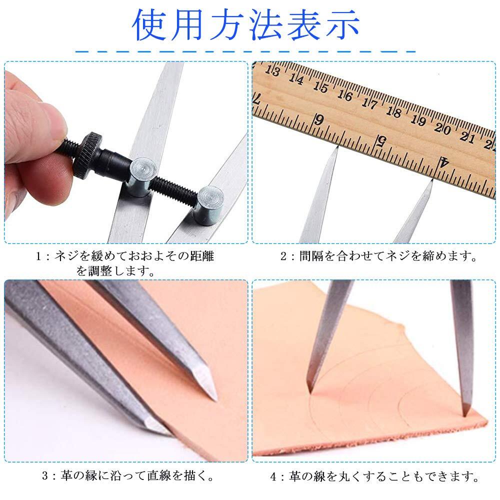 【簡単な操作】:コンパス上部の先端を革や板の水平面にしっかりと固定できるので、思い通りの輪郭形状を正確に描くことができます。エッジに折り目を付けて装飾し、ステッチラインまたは溝にマークを付け、丸みを帯びた角に半径と円を描き、中心を見つけます。