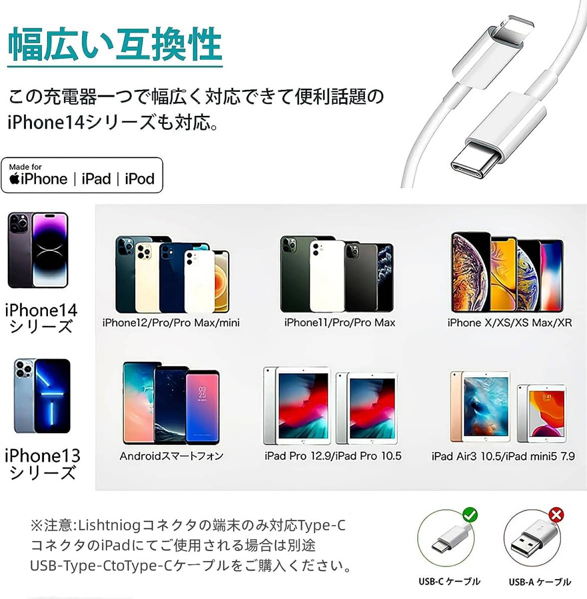 • 【幅広い互換性】USB C PD3.0 iPhone 20W急速PD充電器セットは例えば、iPhone 14,14Plus,14Pro,14Pro Max,13,13Pro,13Pro Max,12, XS,iPhone XS MAX, iPhone XR,iPhone X, iPhone 8, 8 Plus, iPhone 7, 7 Plus, iPhone 6,iPhone 6s, 6 Plus,iPhone 5 ,5C ,5S,iPhone SE, iPad A,ir, Mini、11インチ/ 12.9インチiPadを含みます。 iPad Pro、iPad A,ir(第3世代)、iPad Mini(第5世代)、A,irPods Proなど対応。