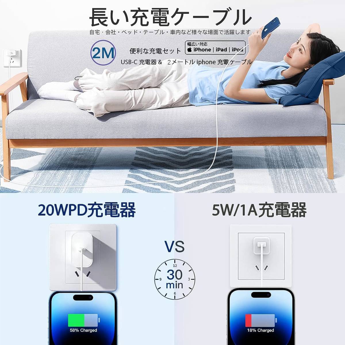 iPhone充電器 20W PD 急速充電 type-c PD充電器 2m USB-C電源アダプタ タイプc 充電器 給電保護機能 適合 iPhone各種機器対応 iPhone 14/13/12/11Pro/ Pro Max/mini/X/XS/XR/8/7 その他USB-C機器対応 (2mセット)