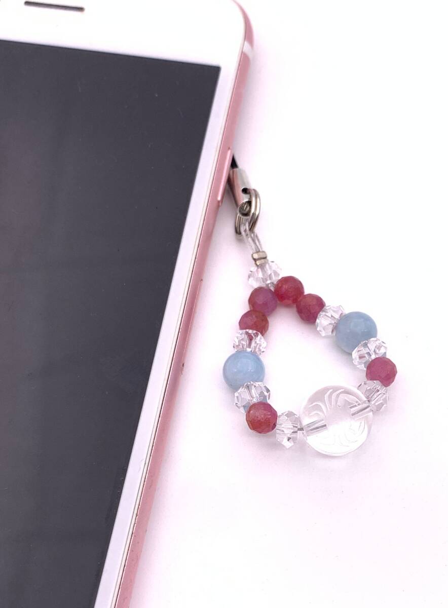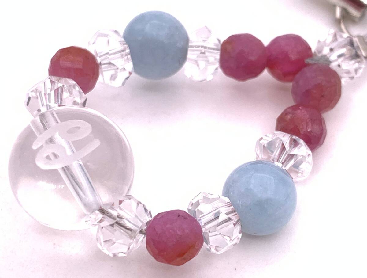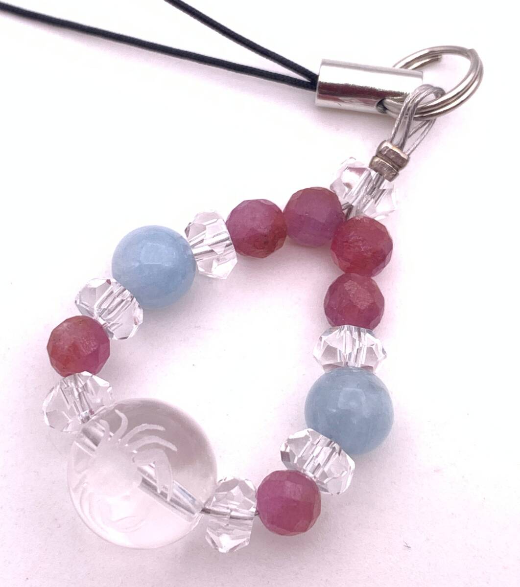 天然石彫り水晶12星座(かに座)&ルビー&アクアマリンのストラップ