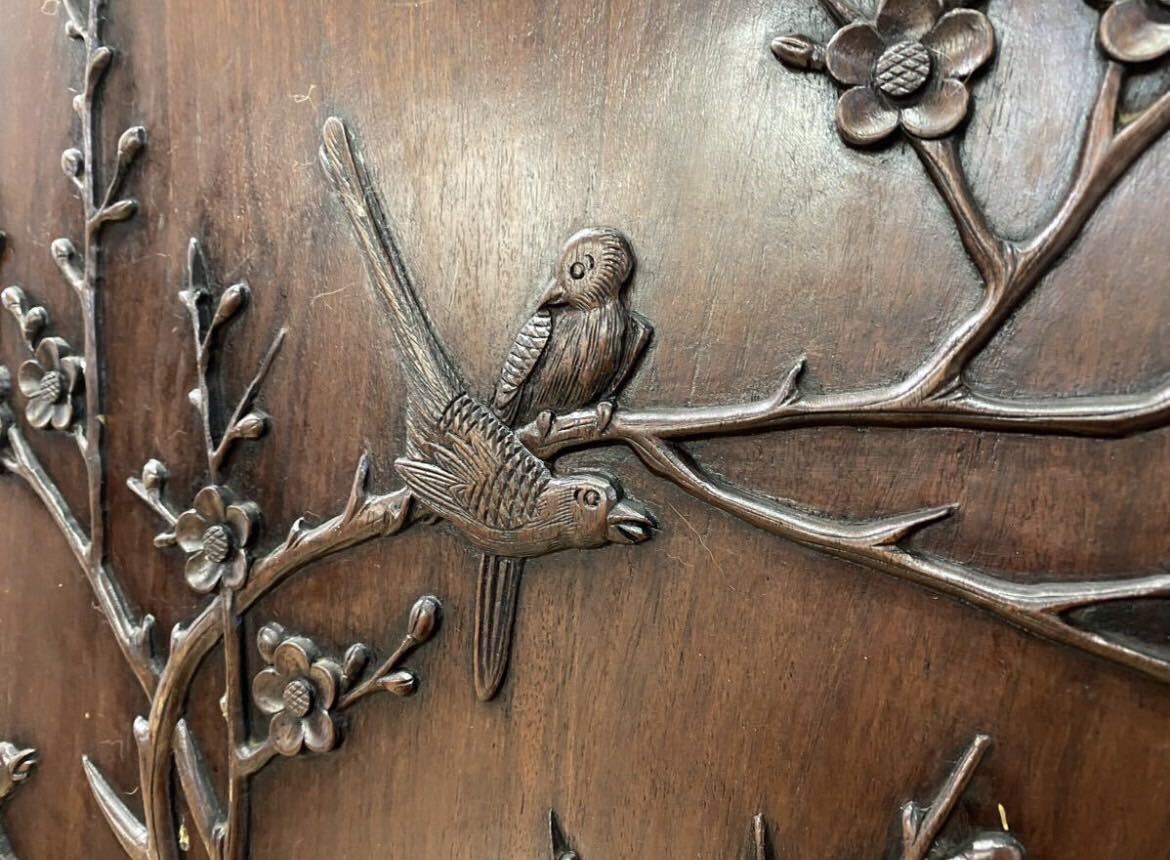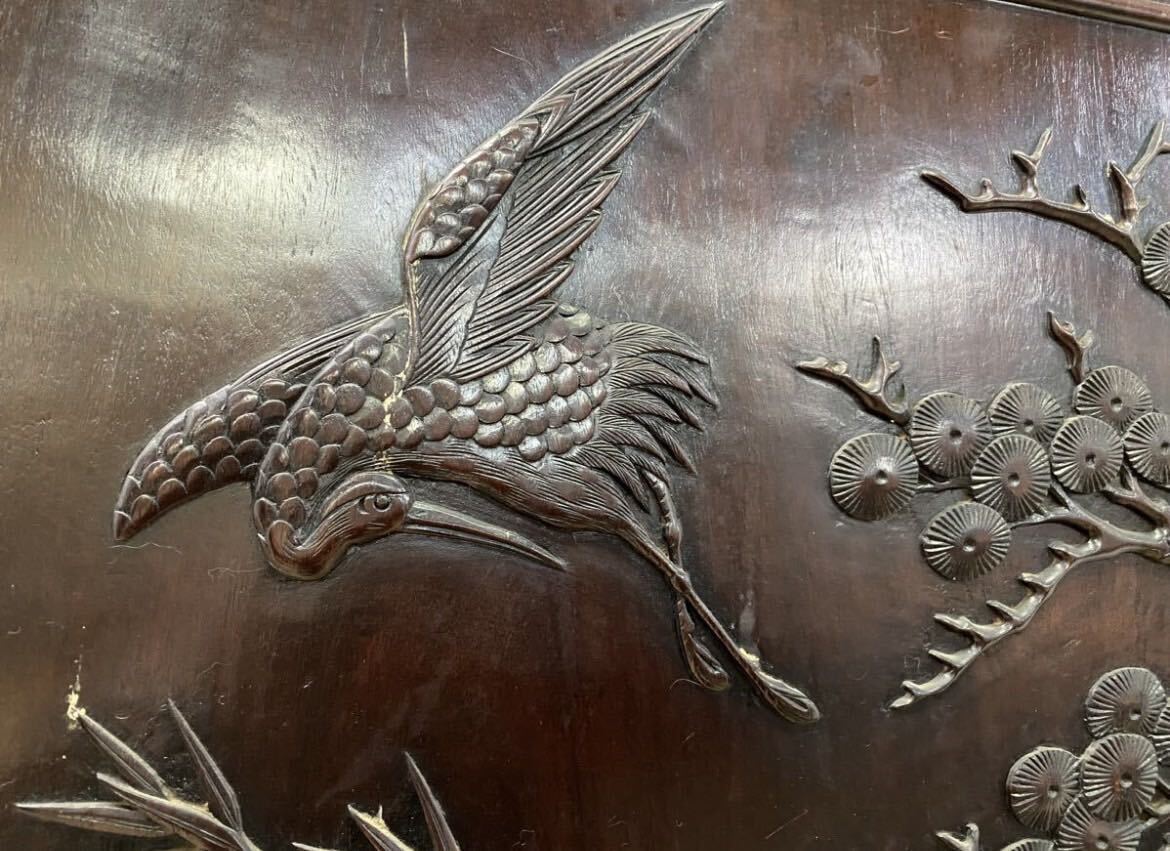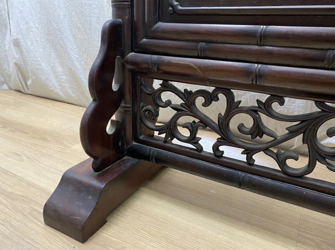 中国古玩唐木 衝立 木彫 鶴 梅図描かれた衝立です。