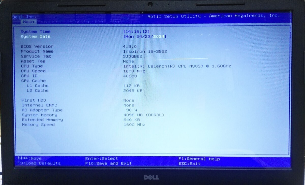 【ジャンク品】管1B78 DELL Inspiron 15-3552 CPU Celeron N3050 Bios起動OK HDD無し、メモリー 4GB、バッテリー有り AC差し込み口難有り