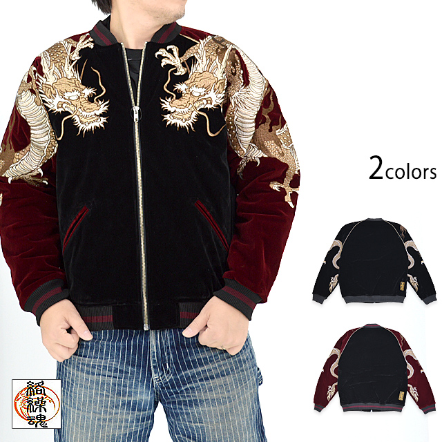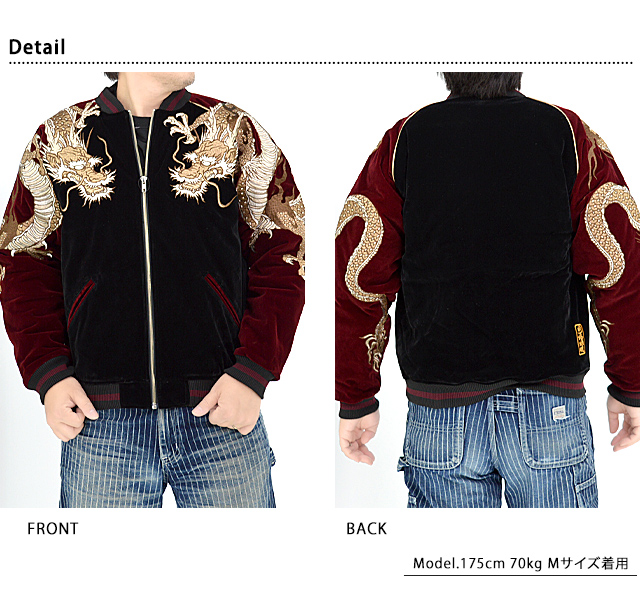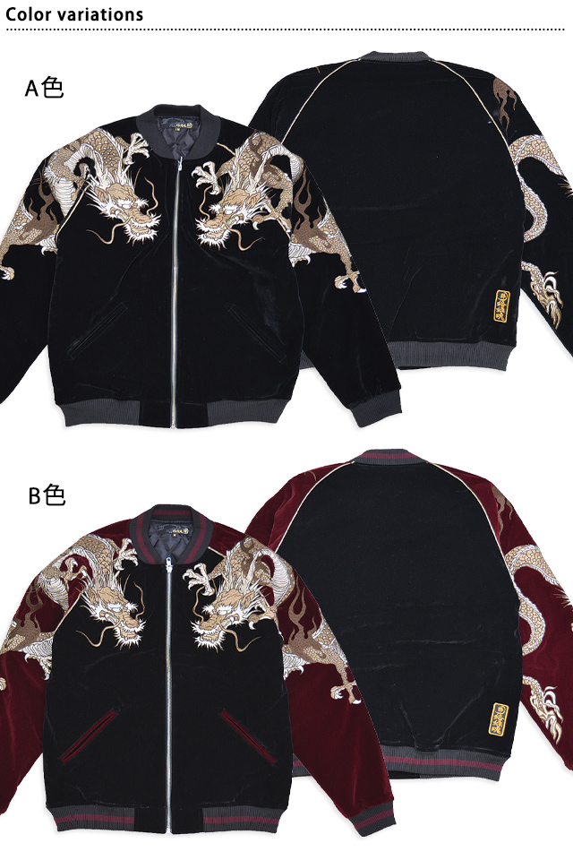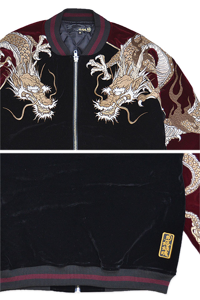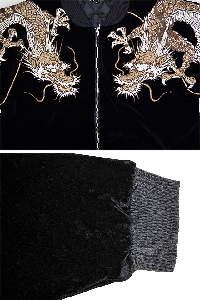 絡繰魂さんから「双龍別珍スカジャン(234003)」のご紹介です。 ボディーに別珍生地を採用したスカジャンが登場しました! 今回は贅沢な総刺繍デザインとなっております。 両肩には双龍をダイナミックに落とし込みました。 柄は縫い目を跨いで身頃から袖へと続いており、実際に着用した際にはより立体感をお楽しみいただけます。 フロントはジップアップ仕様。 | ||||||||||||||||||||