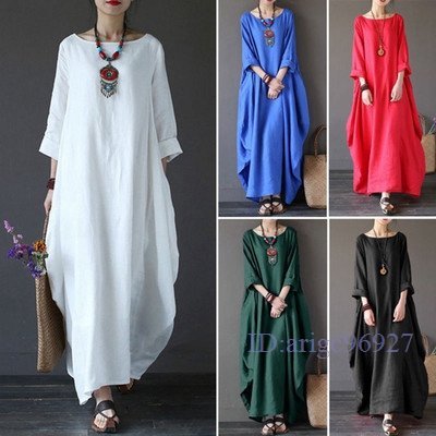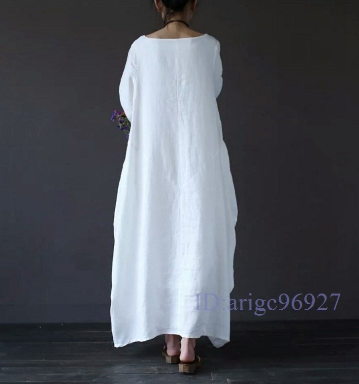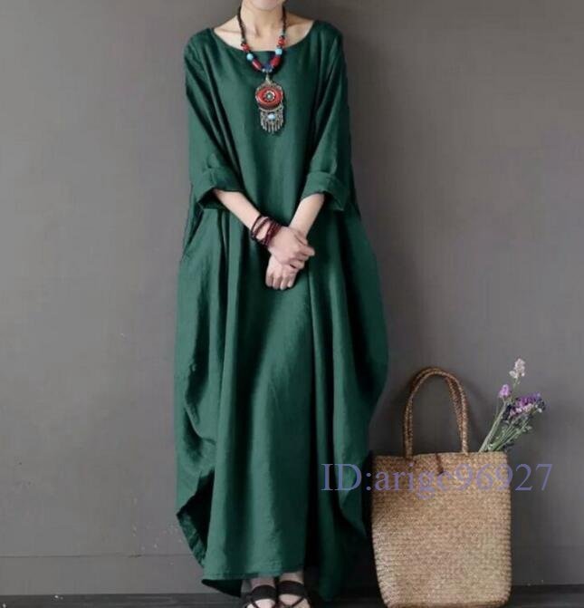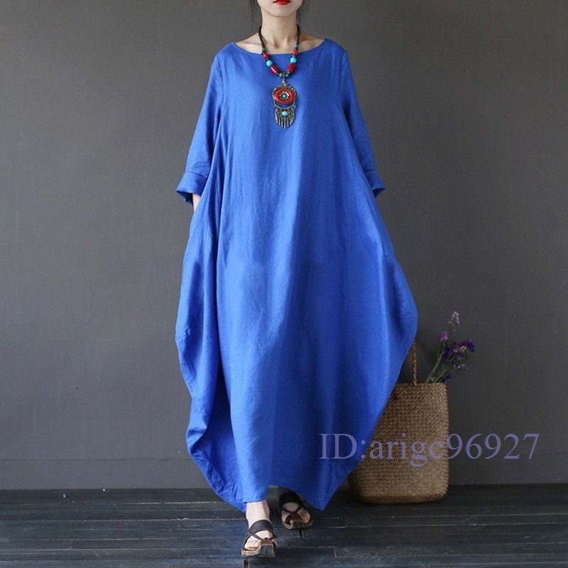 S122☆新品カジュアル ナチュラル ゆったり大きいサイズ 人気 綿麻 体型カバー コットンリネン マキシロングワンピース ブルー