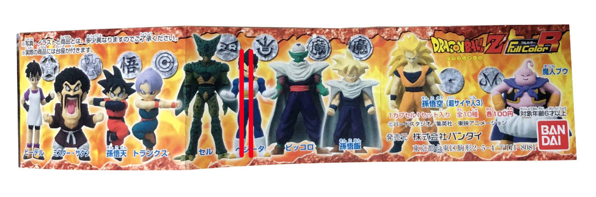 バンダイ ドラゴンボールZ フルカラーR  9種セット です。未使用。ミニブック付き。孫悟空(超サイヤ人3)、魔人ブウ、ミスター・サタン、ビーデル、孫悟天、トランクス(少年)、セル(第一形態)、ピッコロ、孫悟飯(超サイヤ人)の9種、ベジータ欠品。未使用ではありますが、当初からの外箱等の細かな傷等や完品をお求めの方は、ご遠慮下さい。また未使用ではありますが、時間が経過しておりますのであくまでも中古品としてお考え下さい。ノークレーム・ノーリターンでお願い致します。