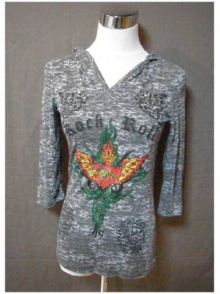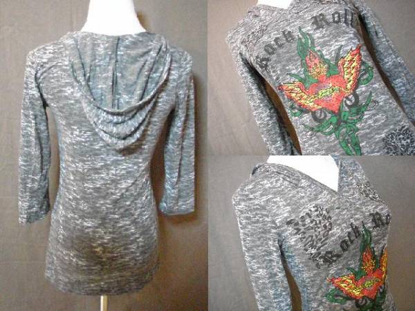 ROCK系キラキラ 5分袖丈 フード付伸縮素材TシャツUS S灰色