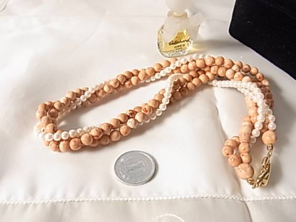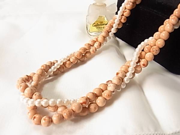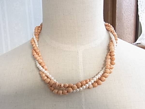 ☆コーラルカラーとパール調*ビーズねじりデザイン3連ネックレス++