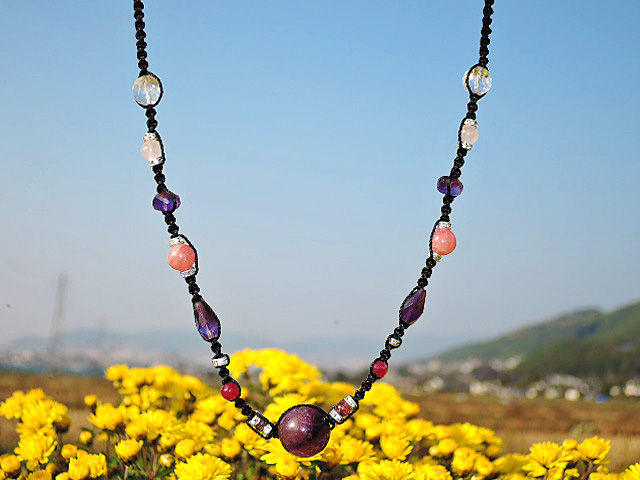 ★スーパーセブンアメジストとラブリーな宝石達★天然石紫水晶ビーズネックレスハンドメイドペンダント★ゲーサイト入りsuper7★kamesan
