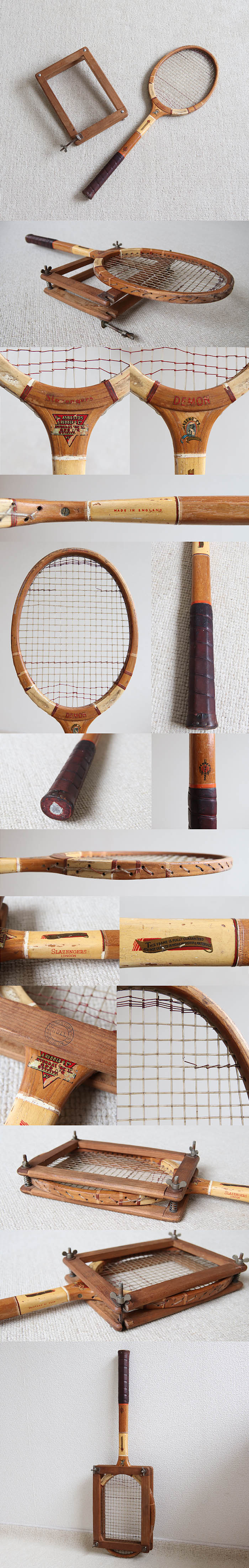 イギリス ビンテージ 木製 テニスラケット/ラケットプレス付き/インテリア/カバー/木枠【雰囲気つくりのディスプレイに】S-681