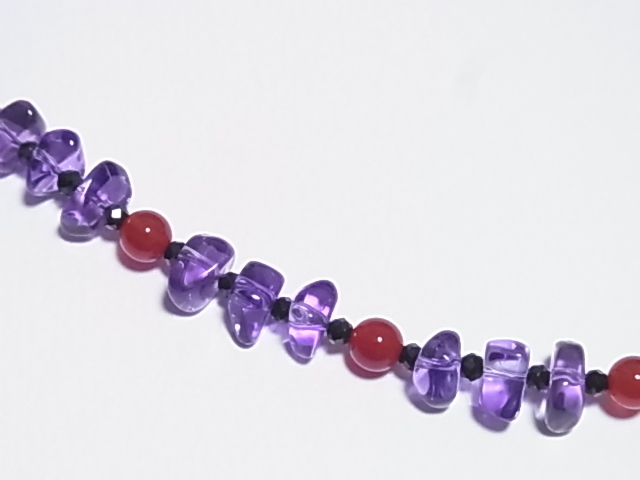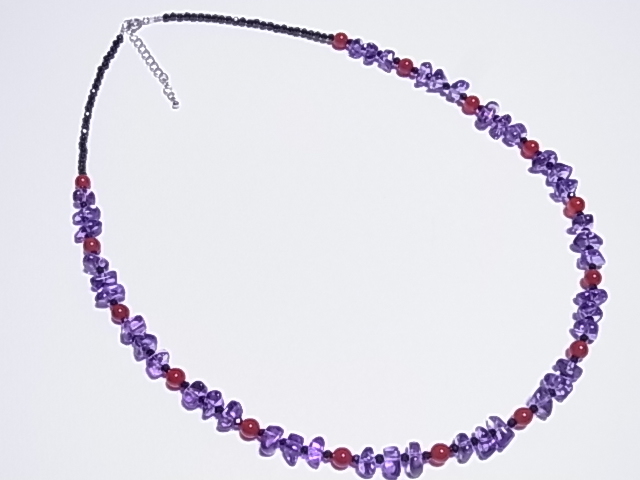 【数量限定販売になります】 天然アメシストのサザレを使った存在感のあるネックレスです。 一般的にビーズに使われるアメシストは、 クラックやインクルージョンが多い品質の石が使われていますが、 このアメシストはビーズとしては非常にクリーンで高品質なアメシストを使用しています。 また一般的なサザレは、尖った部分が多く肌にあたると痛いのですが、このサザレは綺麗に研磨してありますので、肌にあたっても痛くありません。 使用石 : 天然アメシスト 最大幅:約11mm 天然ブラックスピネル 約3mm カット キラキラ輝きます 天然赤瑪瑙(染色処理) 約6mm 長さ : 約65cm(アジャスター5cmを含む) 留め金 : 引き輪式 真鍮製(ロジウム・コーティング) 金属パーツ : 真鍮製(ロジウム・コーティング) 【備考】 誠に勝手ながら、土、日曜日、祝日、長期休暇は、 発送業務をお休みさせていただいておりますので、ご了承下さい。 画像はサンプル画像ですが、サンプル画像と遜色のない商品をお送りします。 出来るだけ実物に近い画像を使っておりますが、実物と多少色が異なる場合がありますので、ご了承下さい。 環境に配慮して、必要以上の梱包をしておりませんのでご理解下さい。 基本的にはチャック袋等に商品を入れ、緩衝材で壊れないように保護してお送り致します。 プレゼント梱包はご対応しておりませんので、ご了承下さい。 スムーズなお取り引きを心掛けておりますが、仕事の都合上、ご返信、発送等に 多少お時間を頂く場合もあるかと思いますが、ご理解の程、よろしくお願いします。 ノークレーム、ノーリターンでお願い致します。 | |||
