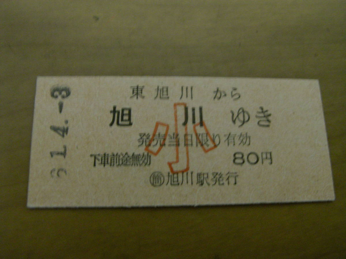 石北本線 東旭川から旭川ゆき 小80円 昭和61年4月3日 簡 旭川駅発行