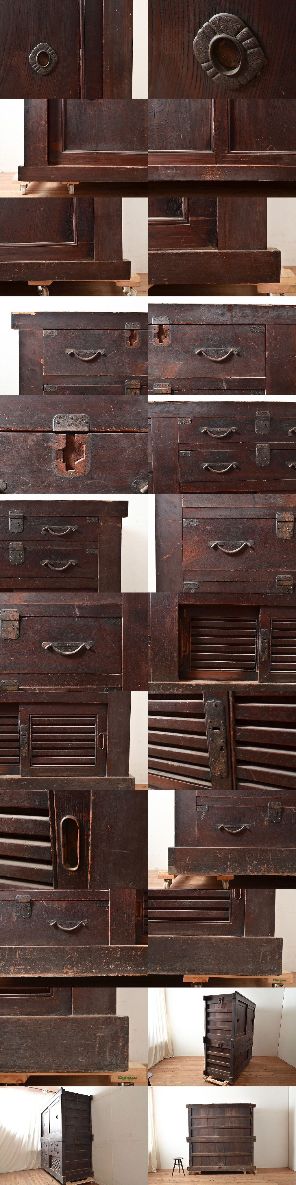 R-048507 和製アンティーク 前面ヒノキ材・ケヤキ材 重ね収納箪笥(夜具箪笥、布団箪笥、水屋箪笥、キャビネット)(R-048507)