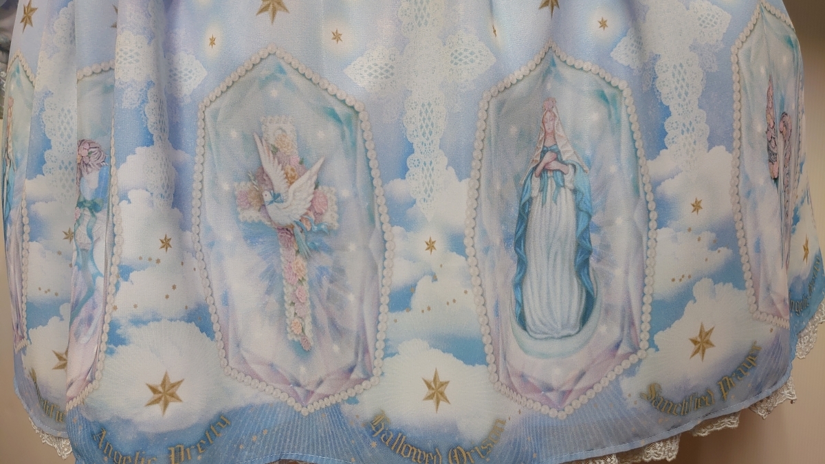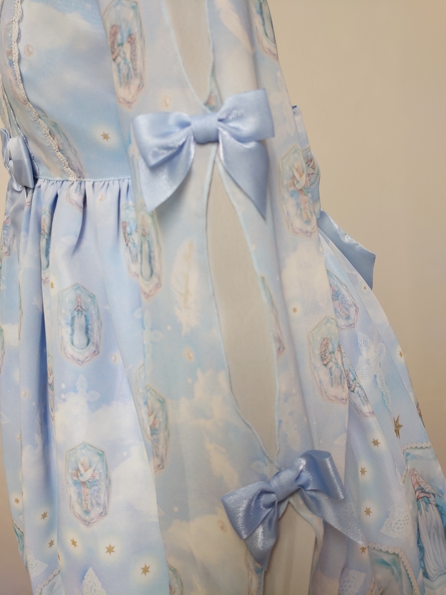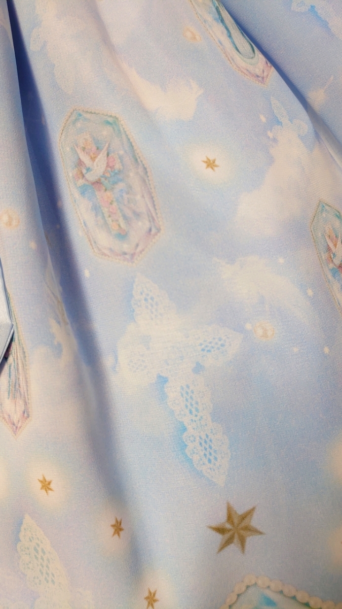 軽やかなシフォンにほんのりピンクやブルーグリーンのグラデーションのお空、きらめく無数の星や舞い散る羽根
