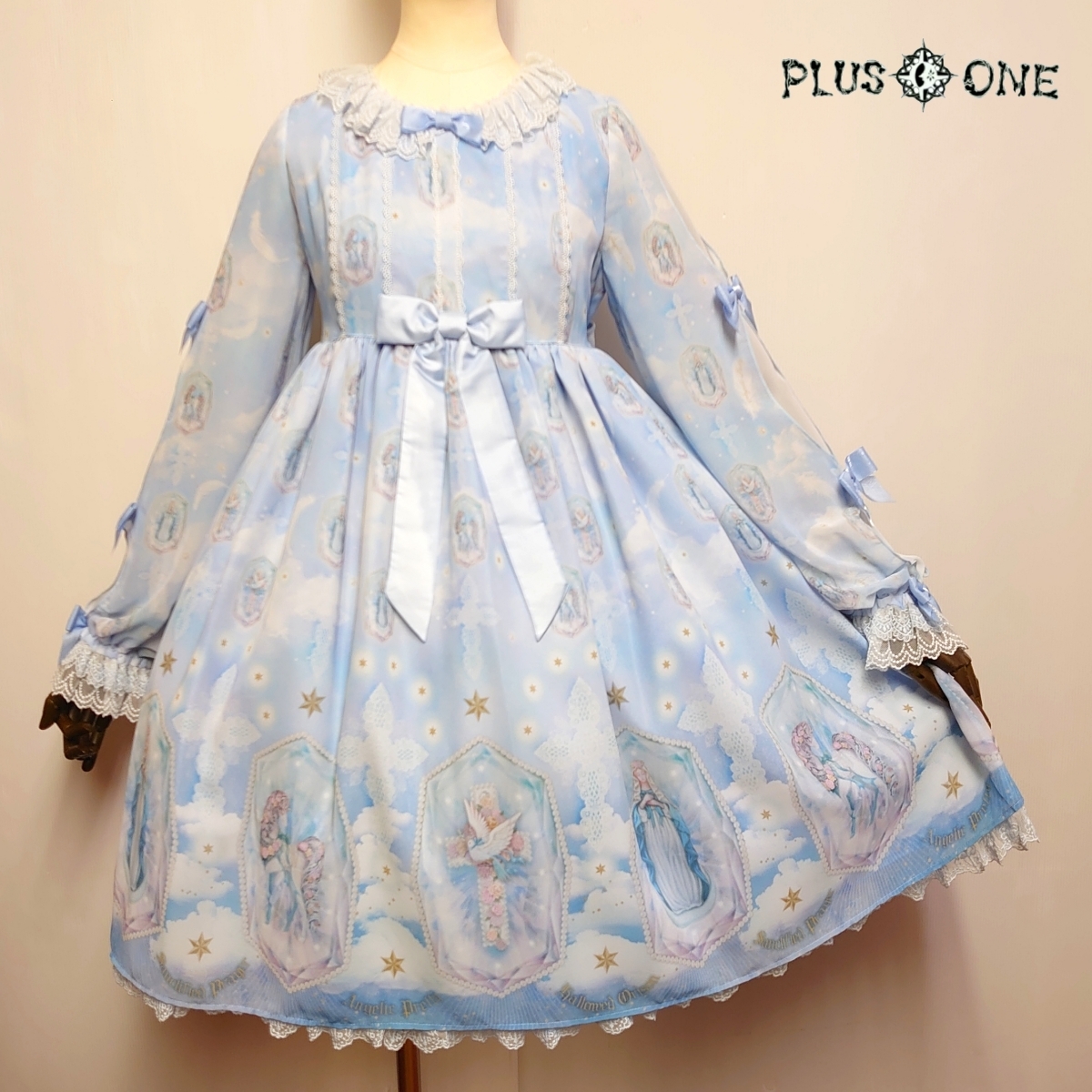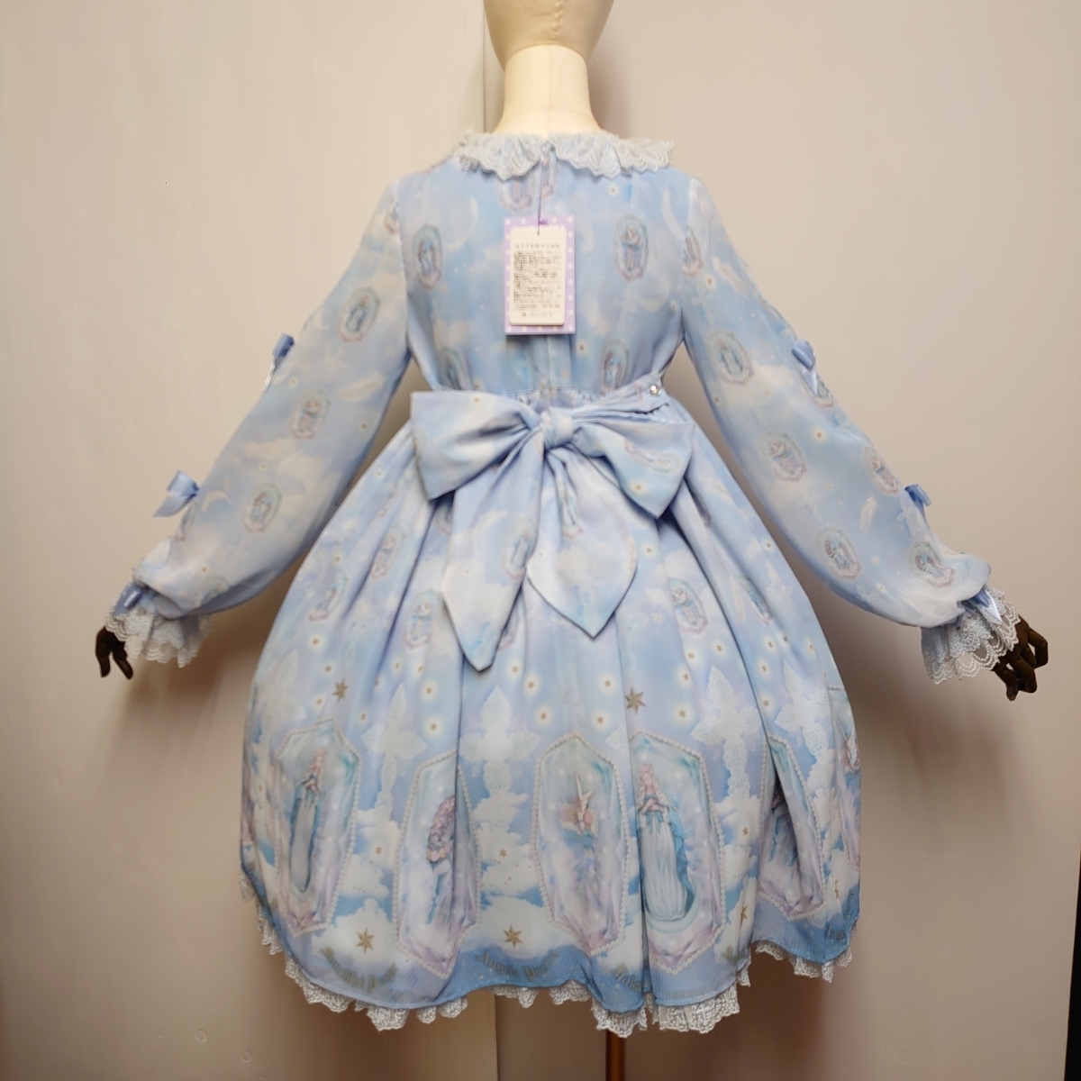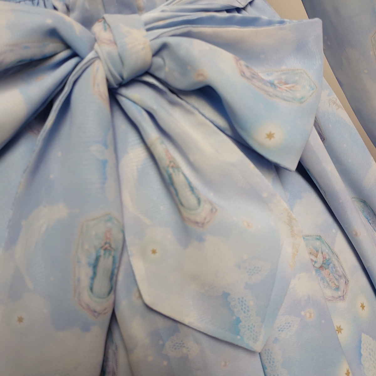 軽やかなシフォンにほんのりピンクやブルーグリーンのグラデーションのお空、きらめく無数の星や舞い散る羽根