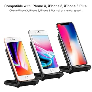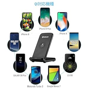 スマホの置く位置のずれはほとんど問題なく、横置きにしてもきちんと充電ができます。 | 【iPhone 8 / iPhone 8 Plus / iPhone X 対応】このqi急速充電器はiPhone 8 / iPhone 8 Plus / iPhone Xに対応できます。底にゴムがあるので、iPhoneの下も傷がつきにくいです。 | パッケージ内容: 1xQi 急速 ワイヤレス充電器 1xType-C充電ケーブル 1x日本語取扱書 ★使用するのが就寝時と言うのもありますが正面に光るLEDが眩しいであれば、向きをかえてもいいです。 ★ワイヤレス充電距離が7mmまでですので、充電時に保護ケースを外したほうがいいです。金属など異物があると、青いライトが点滅して、充電できません。 ★充電中、充電器と携帯が普通に熱くなります。もし携帯の位置が偏位なら、充電できない、充電が不安定、発熱が高いと言う可能性があります。 |