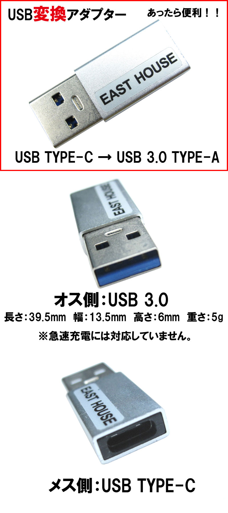 ●あったら便利なアダプター USB 3.1 TYPE-C (メス) を USB 3.0 TYPE-A (オス) に変換するアダプターです。余った線の有効活用や旅行時の荷物削減に! ●ノートパソコン、タブレット、スマートフォン、カメラ、外付けHDDなど、色んな規格のUSBが混在している時に便利です! ●長さ39.5㎜ 幅13.5㎜ 厚さ6㎜ 重さ5g の超コンパクト設計!持ち歩くのに邪魔になりません! ●機器によってはデータ通信ができない場合があります(充電のみとなります)。急速充電はできません。 |