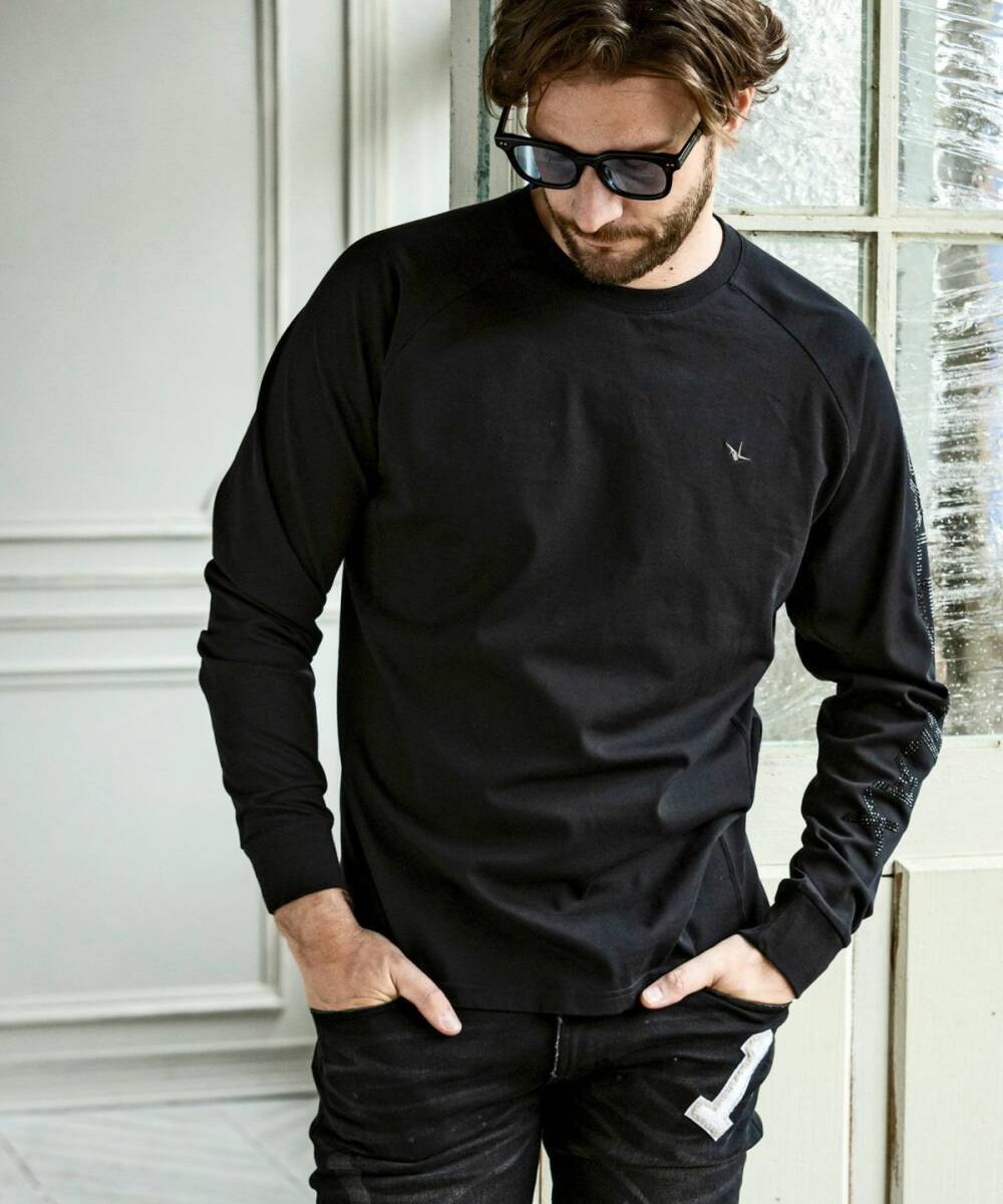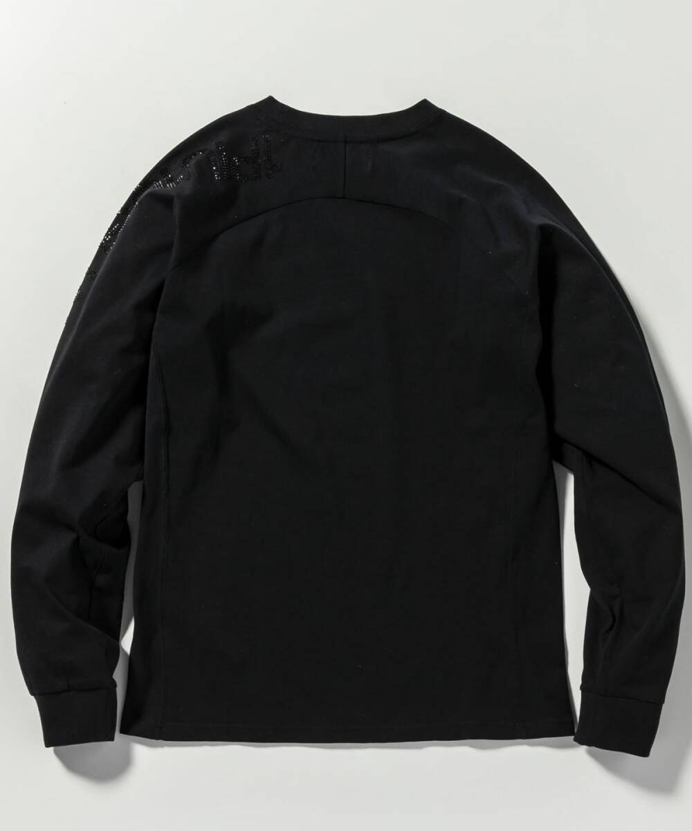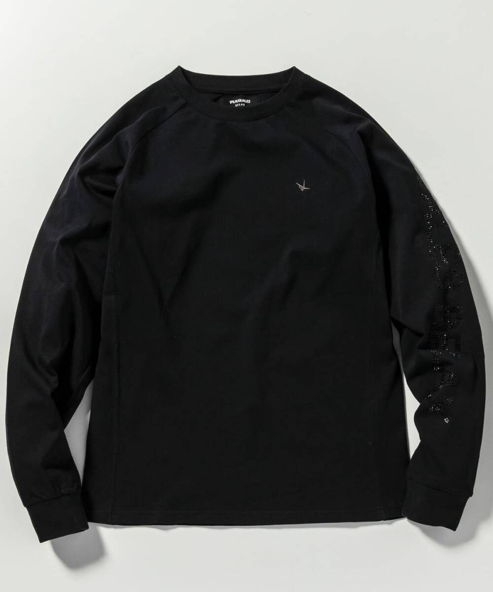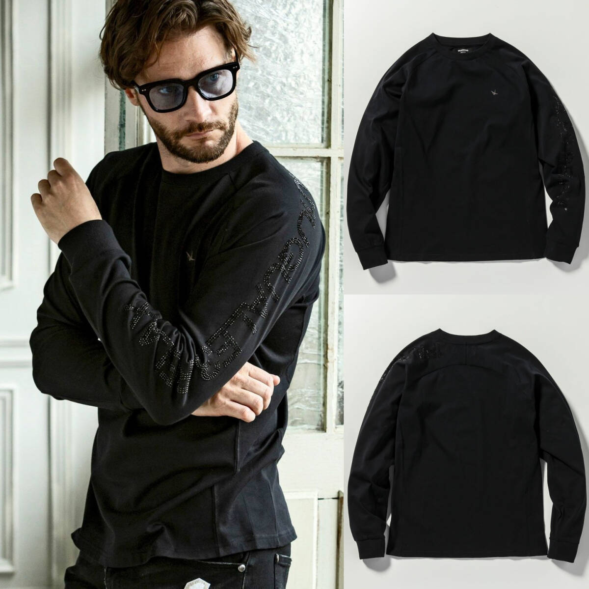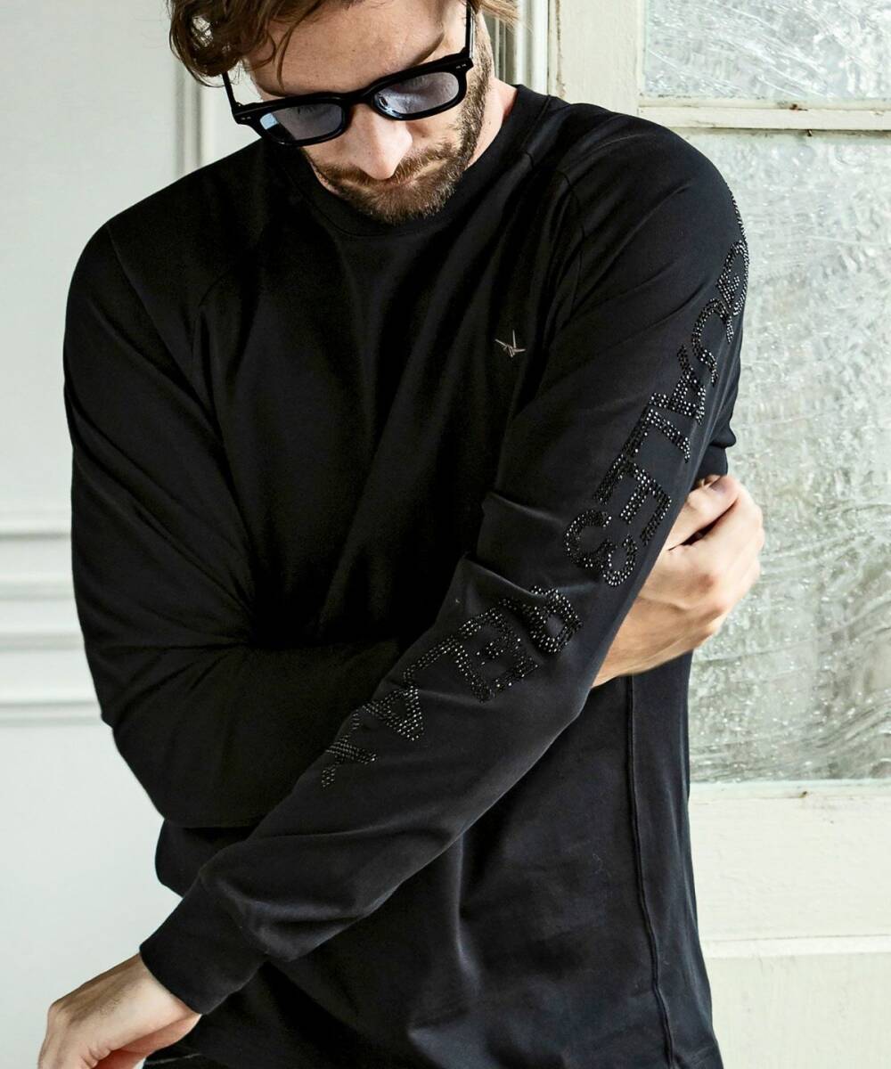 方から袖まで大胆にロゴを配置したロングTシャツ。