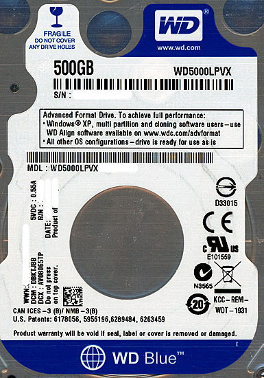 | Western Digital製HDD WD5000LPVX 500GB SATA600 4000~5000時間以内 | |