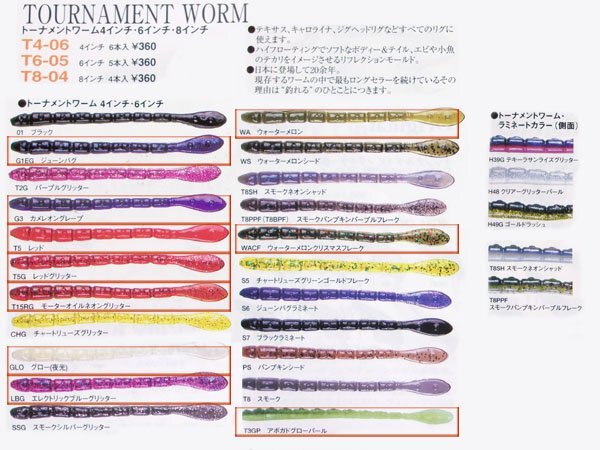 | 商品 |   オ森i471 OFT/オフト トーナメントワーム 4インチ  T4-06【2】★10色セット  各色36本 ★計360本セット★ ◆ジューンバグ(G1EG) ◆カメレオングレープ(G3) ◆レッド(T5) ◆レッドグリッター(T5G) ◆モーターオイルネオングリッター(T15GR) ◆グロー(夜光)(GLO) ◆エレクトリックブルーグリッター(LBG) ◆ウォーターメロン(WA) ◆ウォーターメロンクリスマスフレーク(WACF) ◆アボカドグローパール(T3GP) スーパーソフト&ハイフローター素材 集魚剤:フィッシュフォーミュラー入 ☆新品☆  |